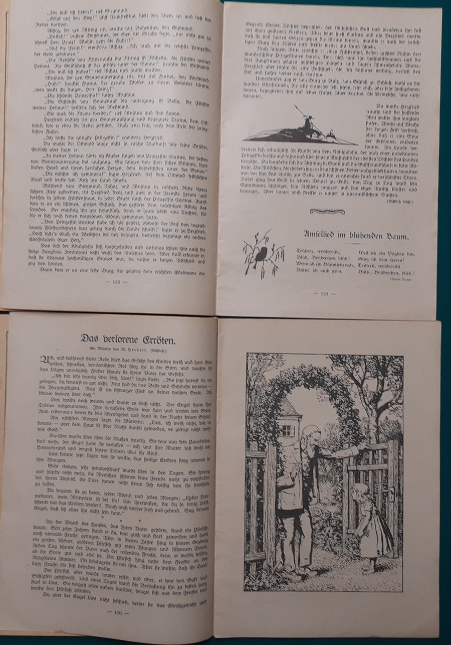 Johanna Weiskirch: Türkische Stimmungsbilder; Helen Fidelis Butsch: Die Königsbraut; I. Mose: Wie die Alten sungen; Marianne Spitzler: Vom Barfußgehen | ohne Beilage; sehr guter altersgemäßer Zustand | 4 |