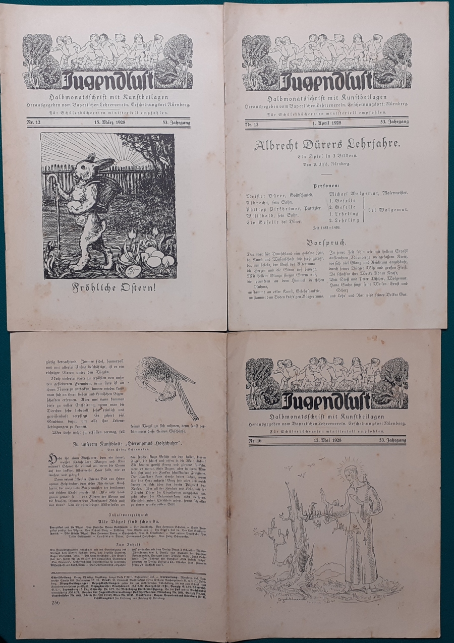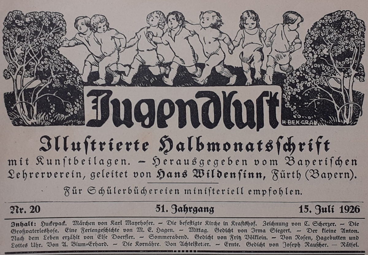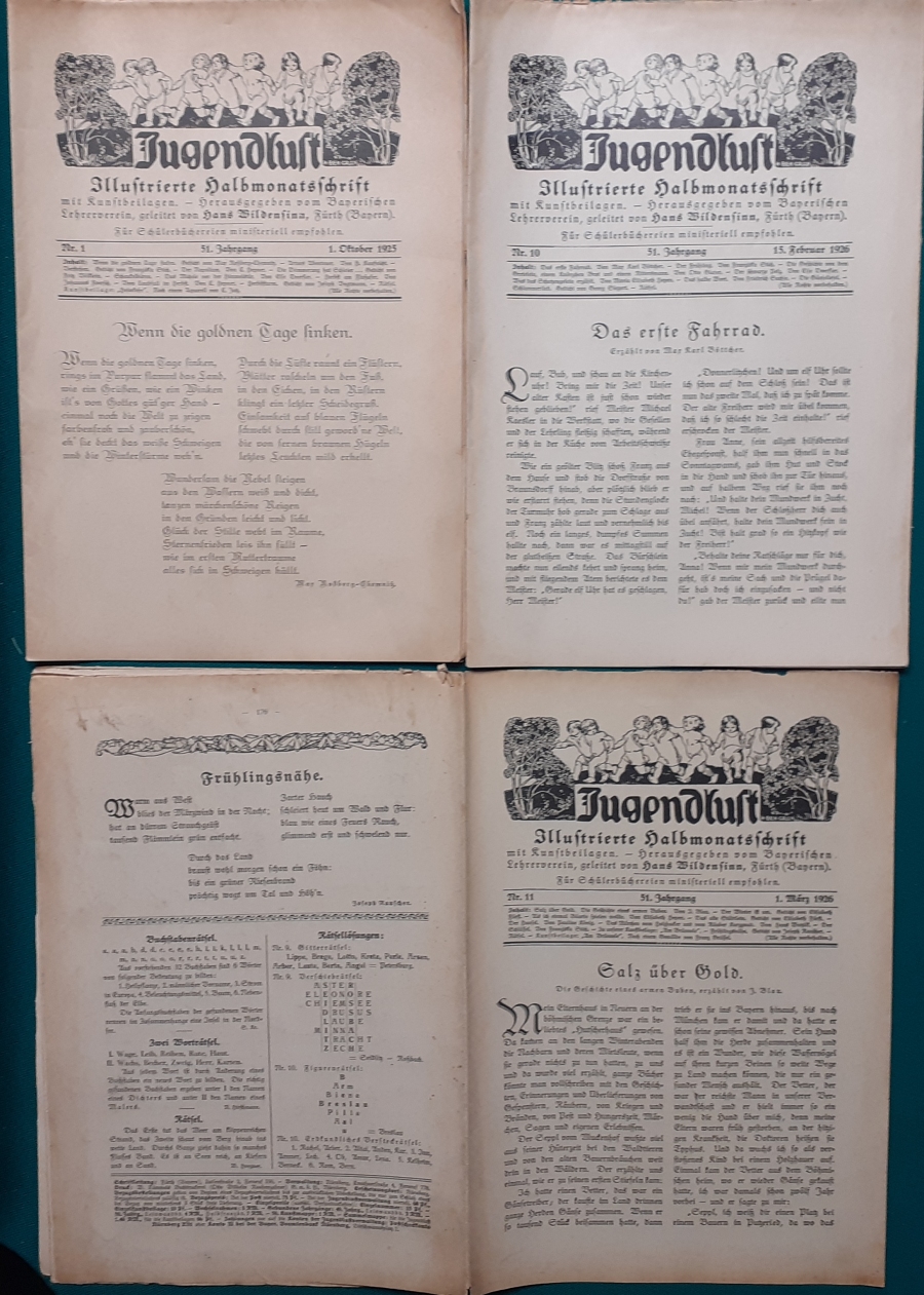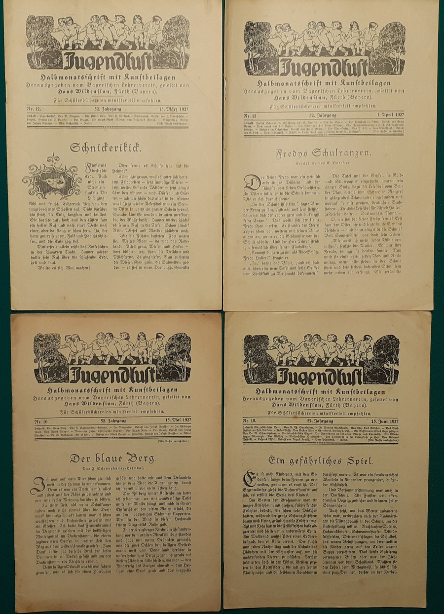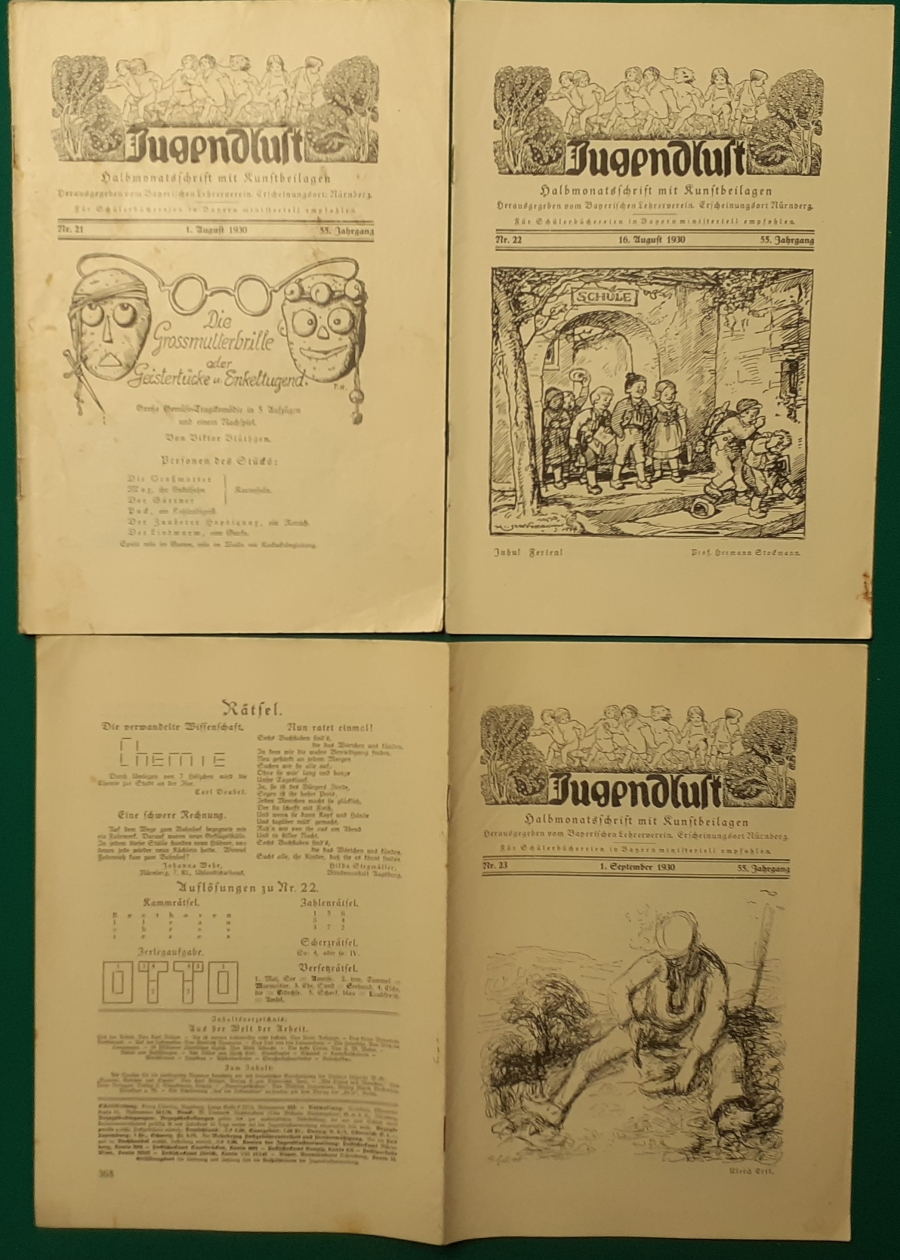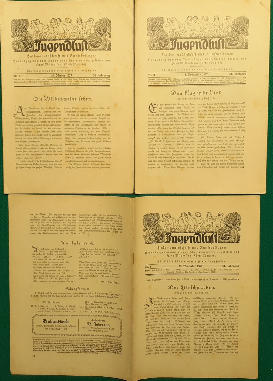 Hrsg. Bayerischer Lehrerverein, Nürnberg; es handelt sich um halbmonatlich erscheinende 16 Seiten umfassende Schriften im Format 25 x 17 cm; mit sehr schönen Bildern namhafter Illustratoren, z.B. Else Wenz-Vietor, Hermann Stockmann, Carl Storch, Ernst Kreidolf u.a. Rubriken: Erzählungen, Märchen, Sagen, Briefe - Gedichte, Noten - Belehrendes - Zur Beschäftigung - Rätsel und Scherz - Kunstbeilagen - Aufführungen |