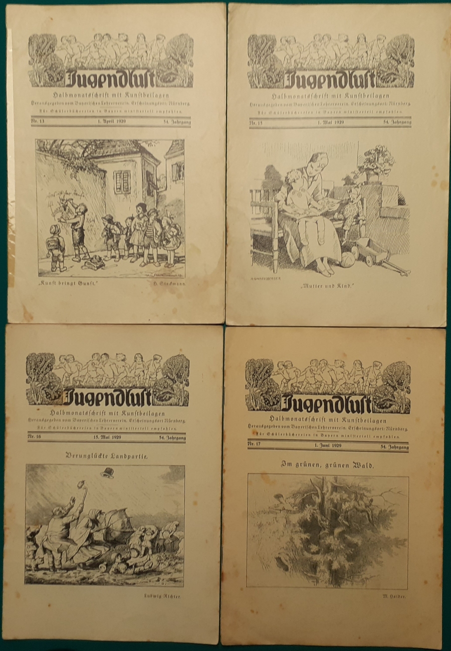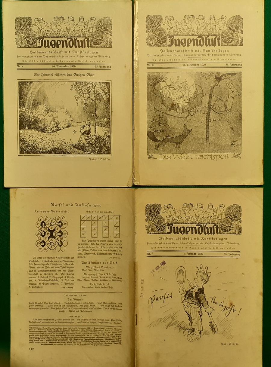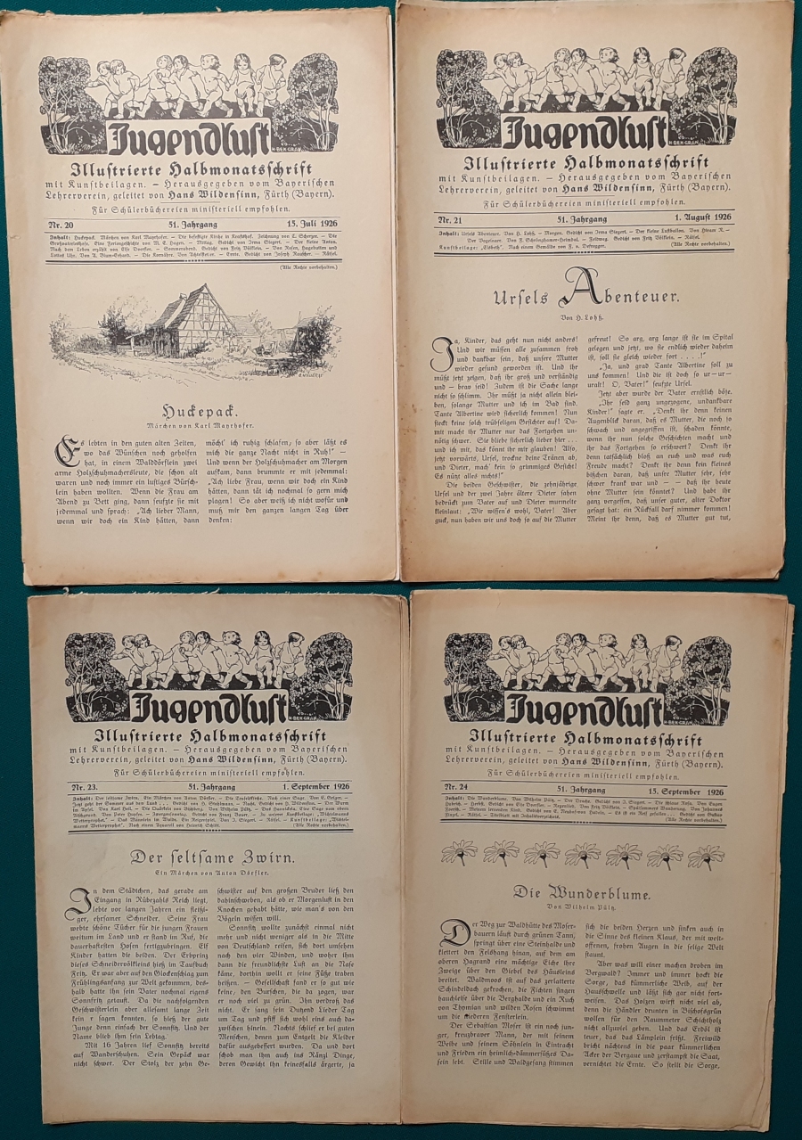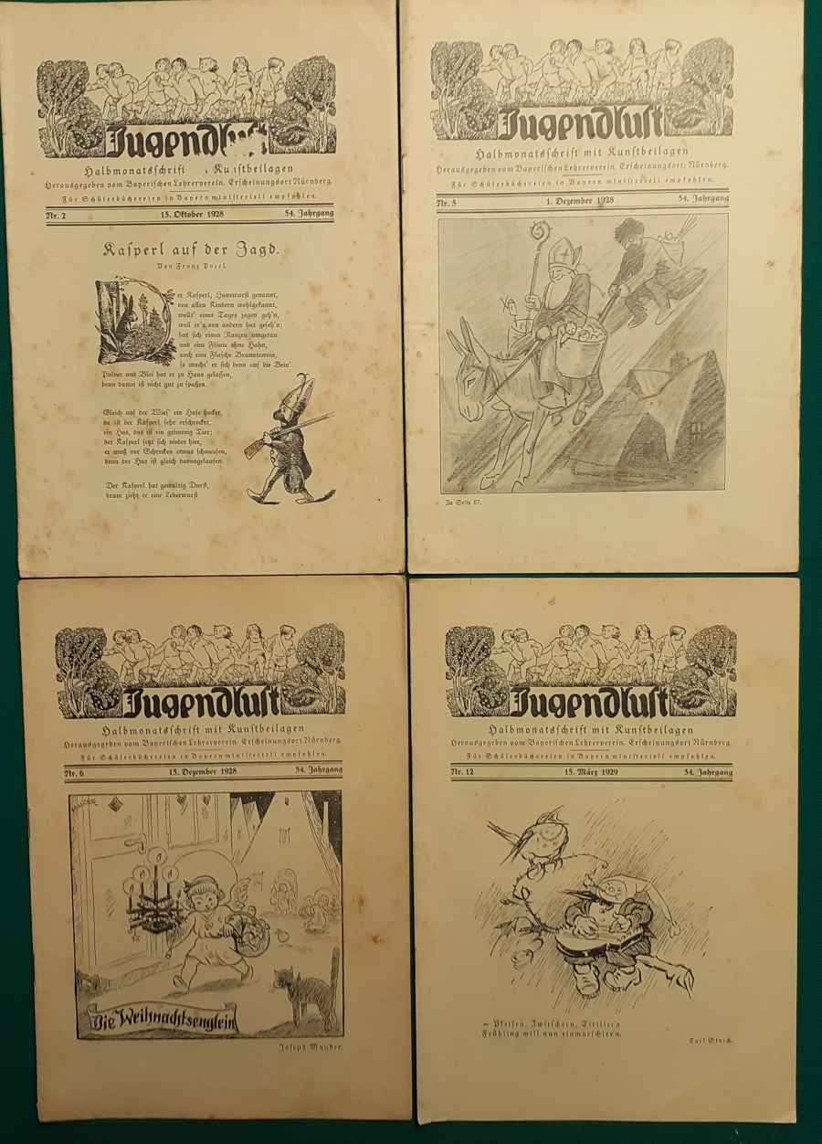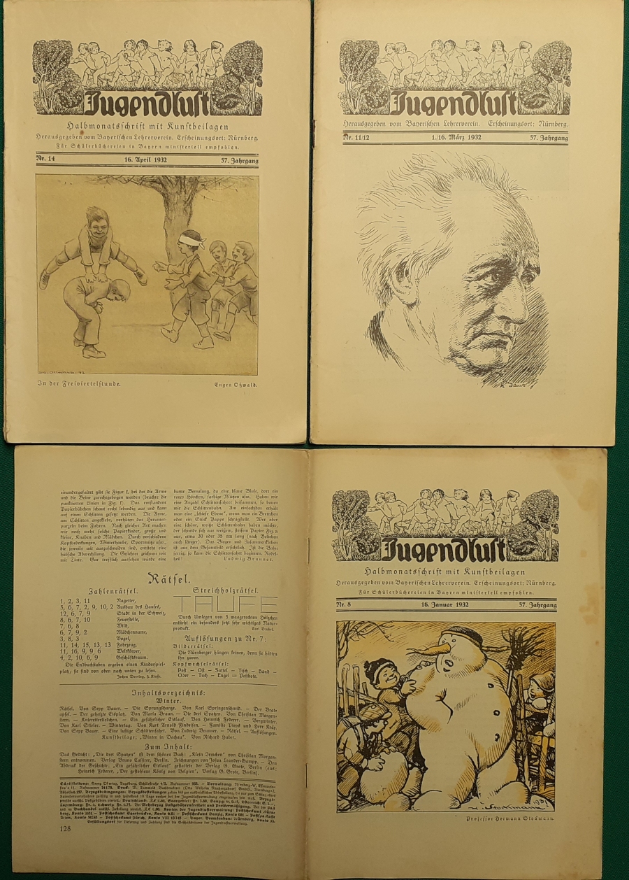 Hrsg. Bayerischer Lehrerverein, Nürnberg; es handelt sich um halbmonatlich erscheinende 16 Seiten umfassende Schriften im Format 25 x 17 cm; mit sehr schönen Bildern namhafter Illustratoren, z.B. Else Wenz-Vietor, Hermann Stockmann, Carl Storch, Ernst Kreidolf u.a. Rubriken: Erzählungen, Märchen, Sagen, Briefe - Gedichte, Noten - Belehrendes - Zur Beschäftigung - Rätsel und Scherz - Kunstbeilagen - Aufführungen |