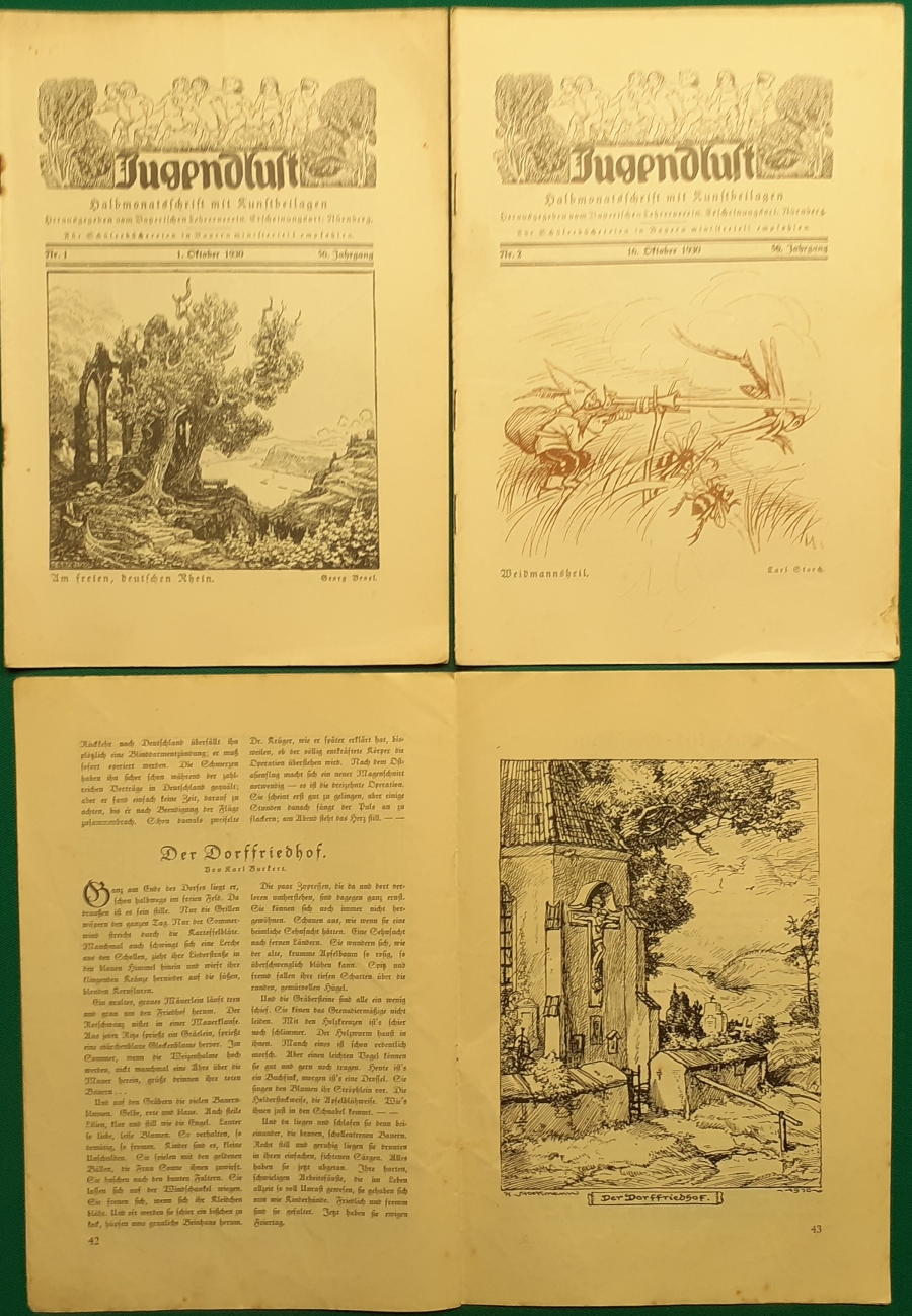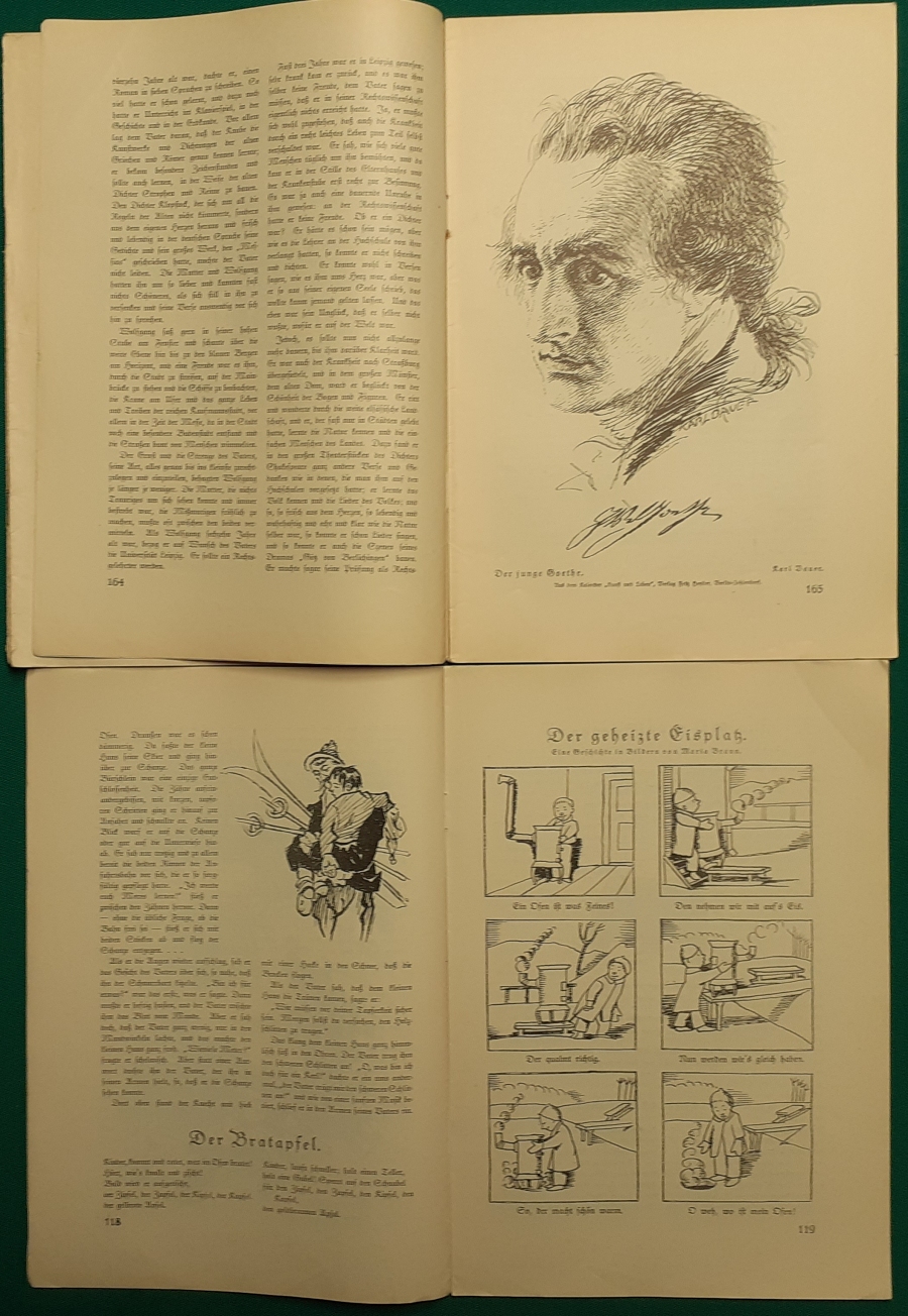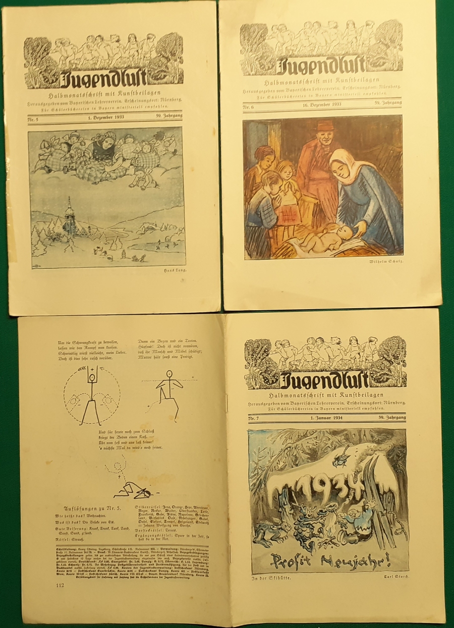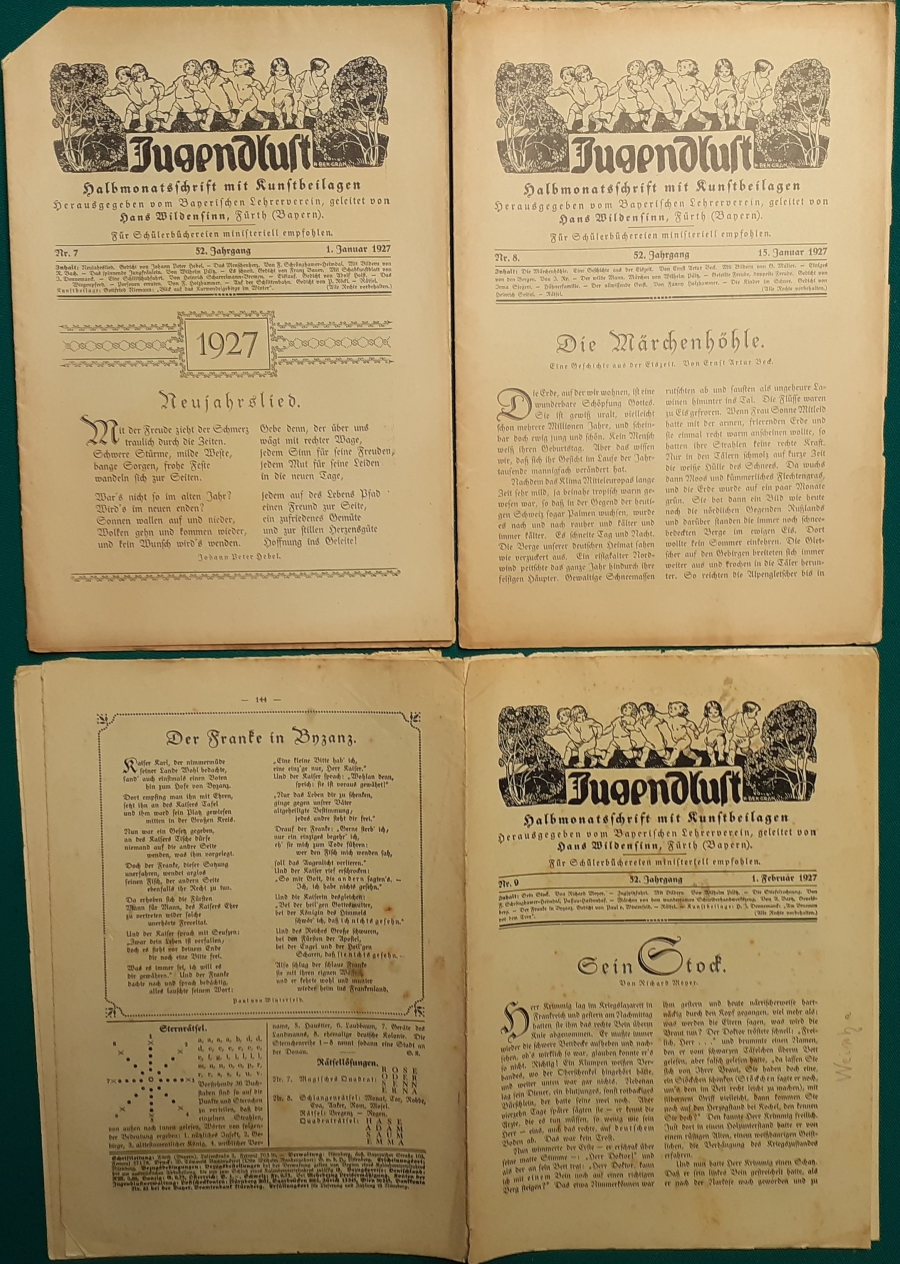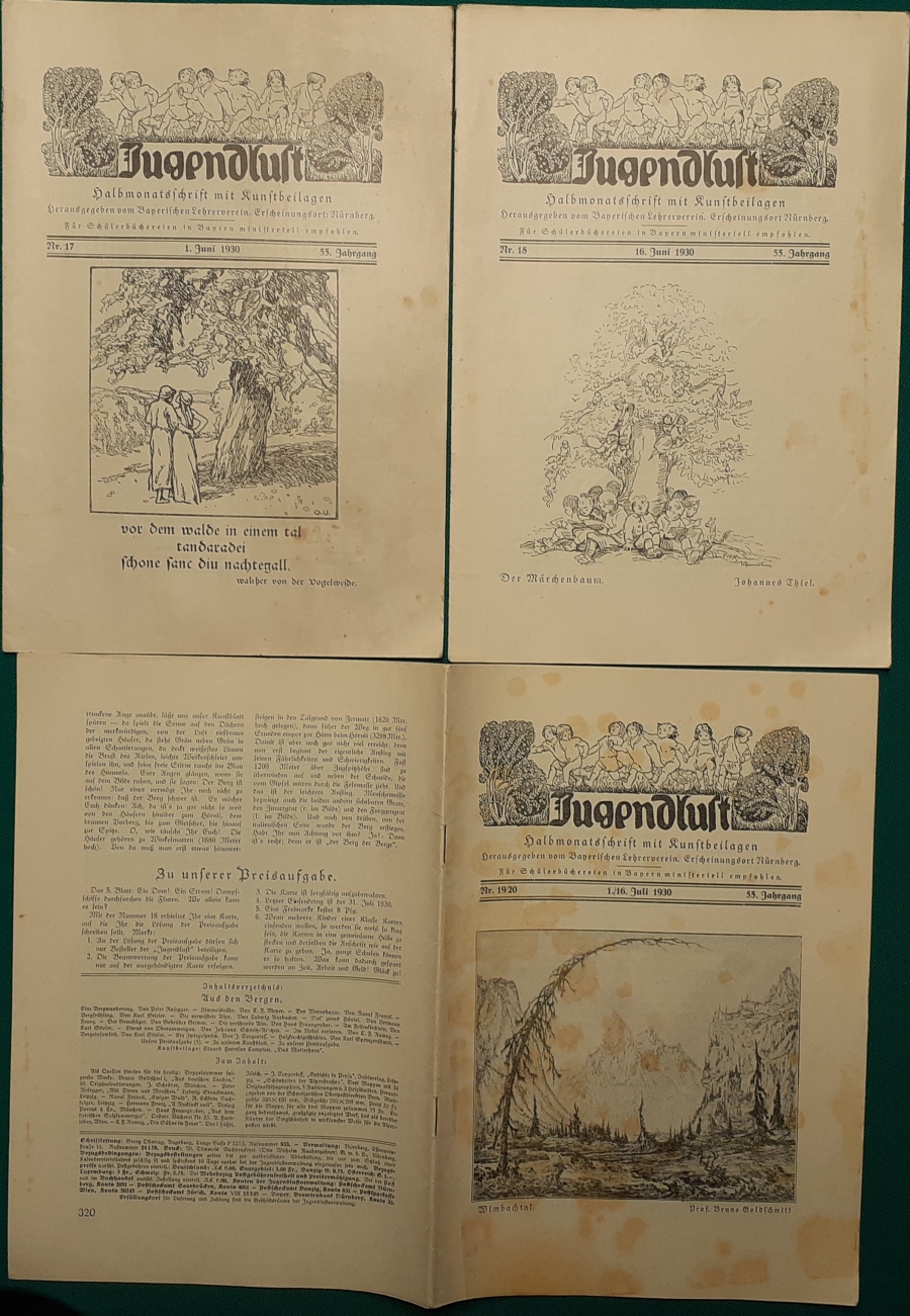 Hrsg. Bayerischer Lehrerverein, Nürnberg; es handelt sich um halbmonatlich erscheinende 16 Seiten umfassende Schriften im Format 25 x 17 cm; mit sehr schönen Bildern namhafter Illustratoren, z.B. Else Wenz-Vietor, Hermann Stockmann, Carl Storch, Ernst Kreidolf u.a. Rubriken: Erzählungen, Märchen, Sagen, Briefe - Gedichte, Noten - Belehrendes - Zur Beschäftigung - Rätsel und Scherz - Kunstbeilagen - Aufführungen |