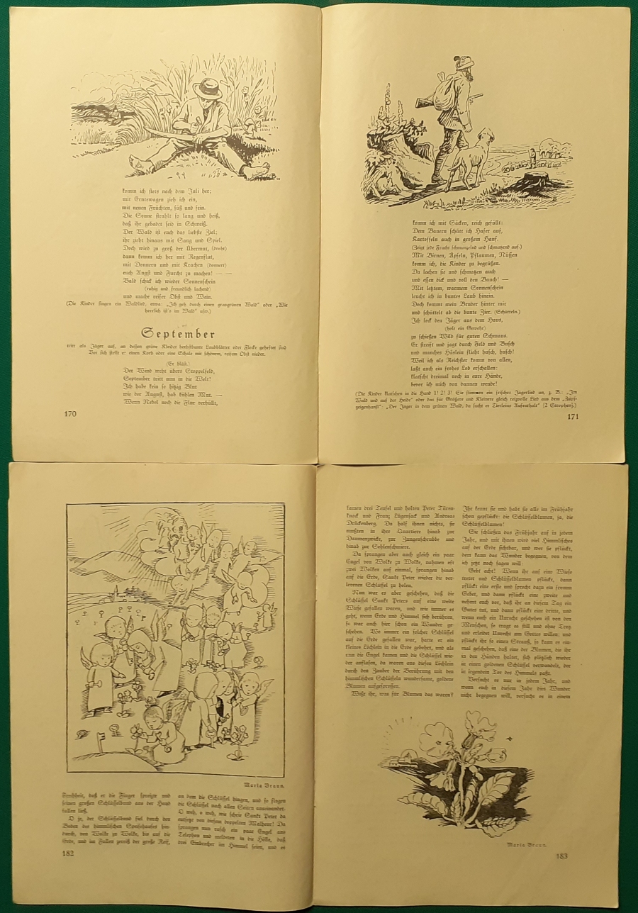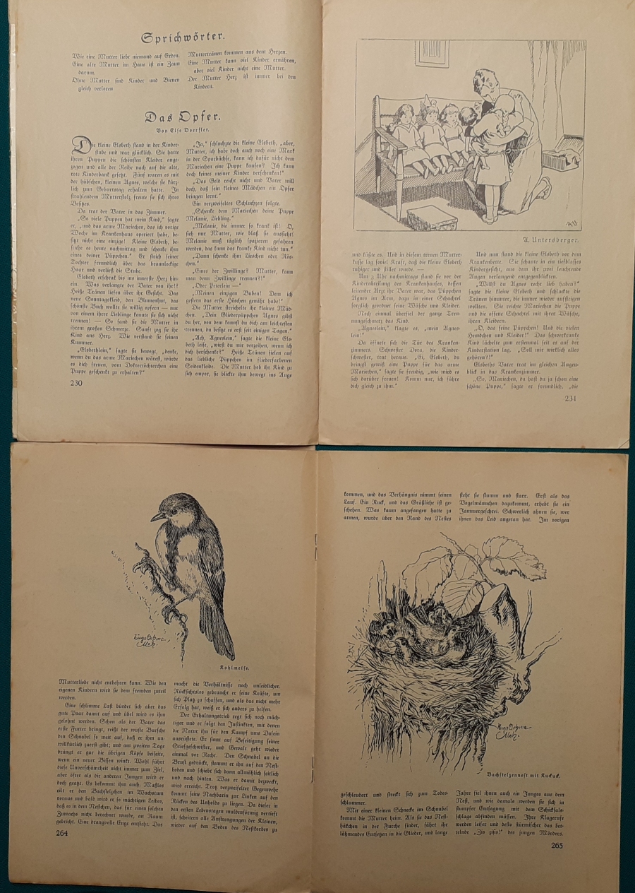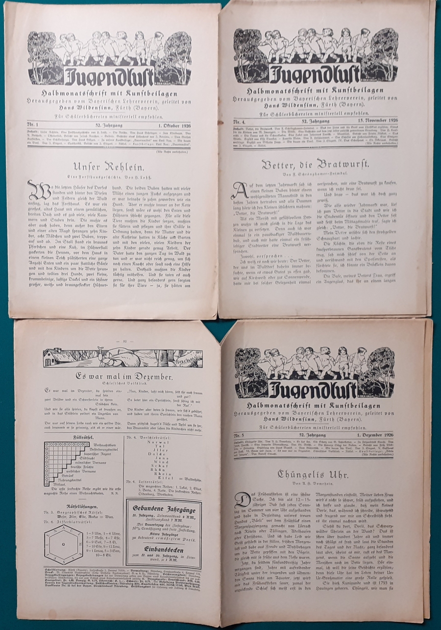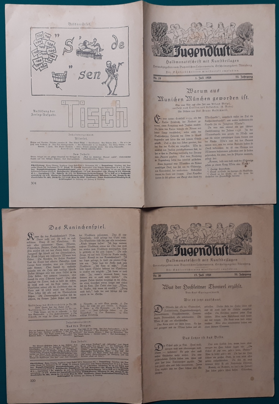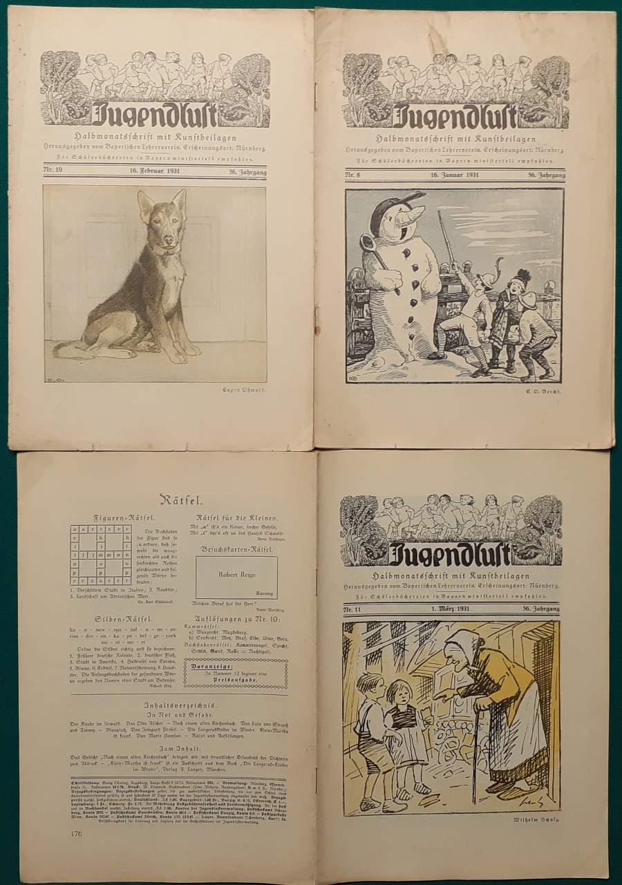 Hrsg. Bayerischer Lehrerverein, Nürnberg; es handelt sich um halbmonatlich erscheinende 16 Seiten umfassende Schriften im Format 25 x 17 cm; mit sehr schönen Bildern namhafter Illustratoren, z.B. Else Wenz-Vietor, Hermann Stockmann, Carl Storch, Ernst Kreidolf u.a. Rubriken: Erzählungen, Märchen, Sagen, Briefe - Gedichte, Noten - Belehrendes - Zur Beschäftigung - Rätsel und Scherz - Kunstbeilagen - Aufführungen |