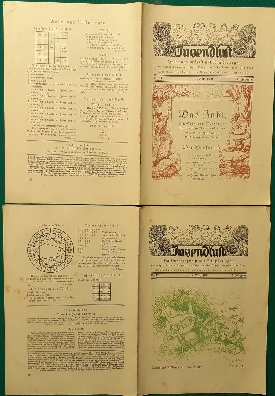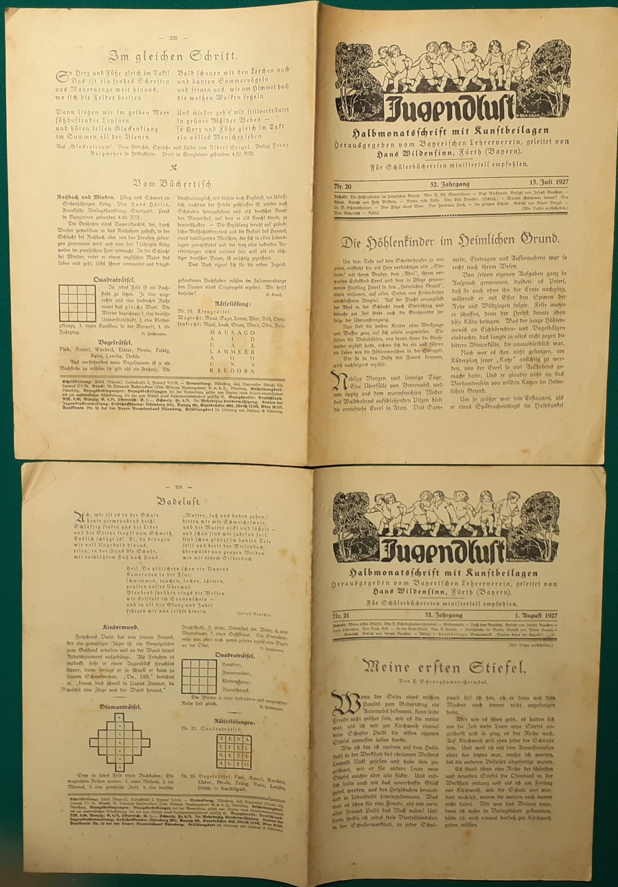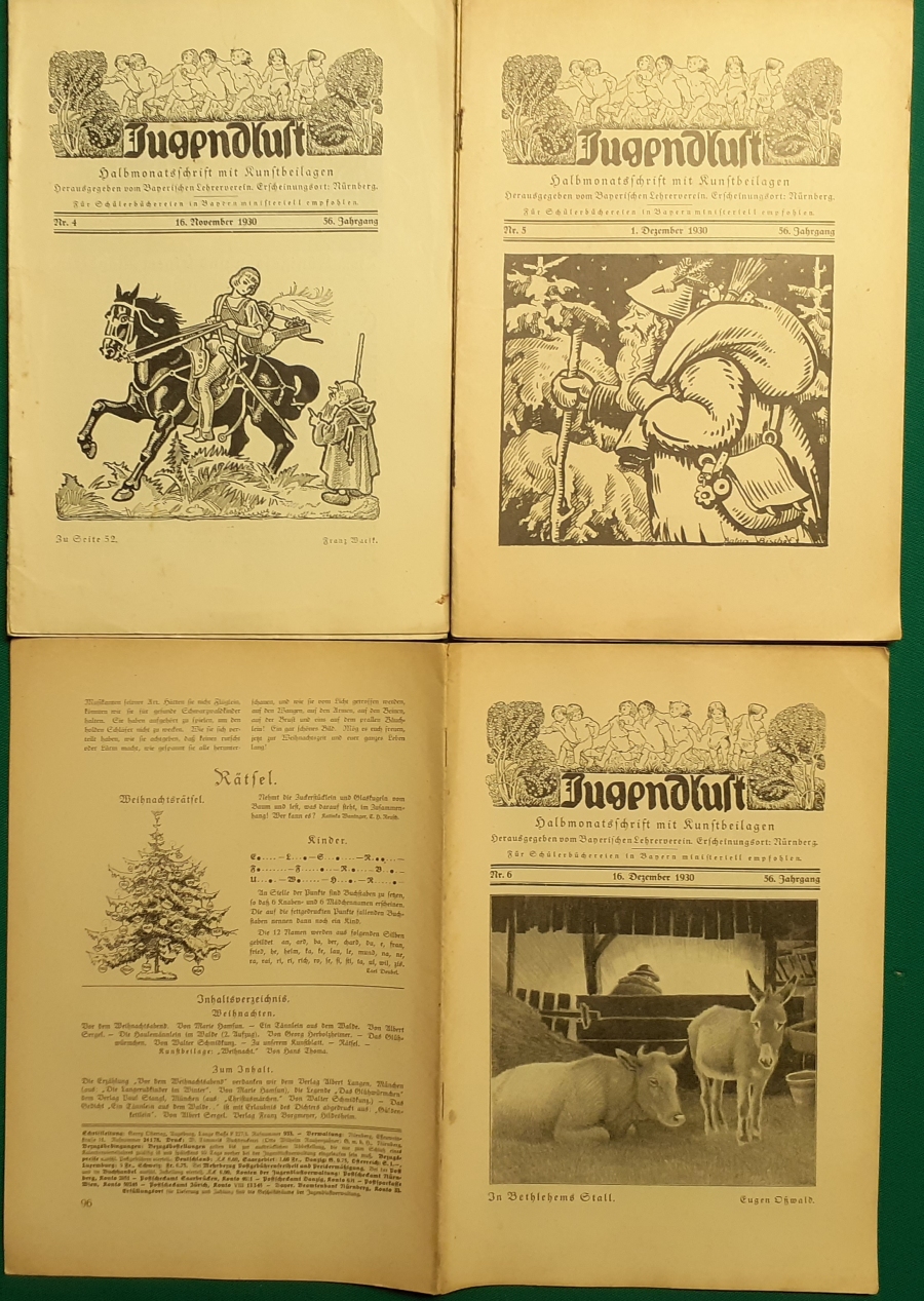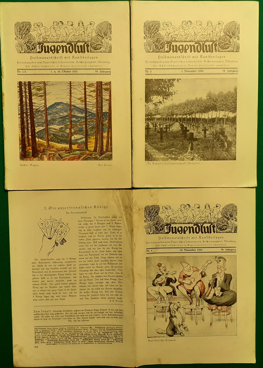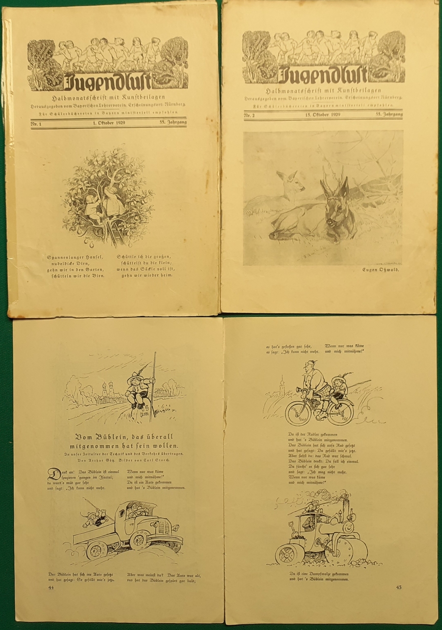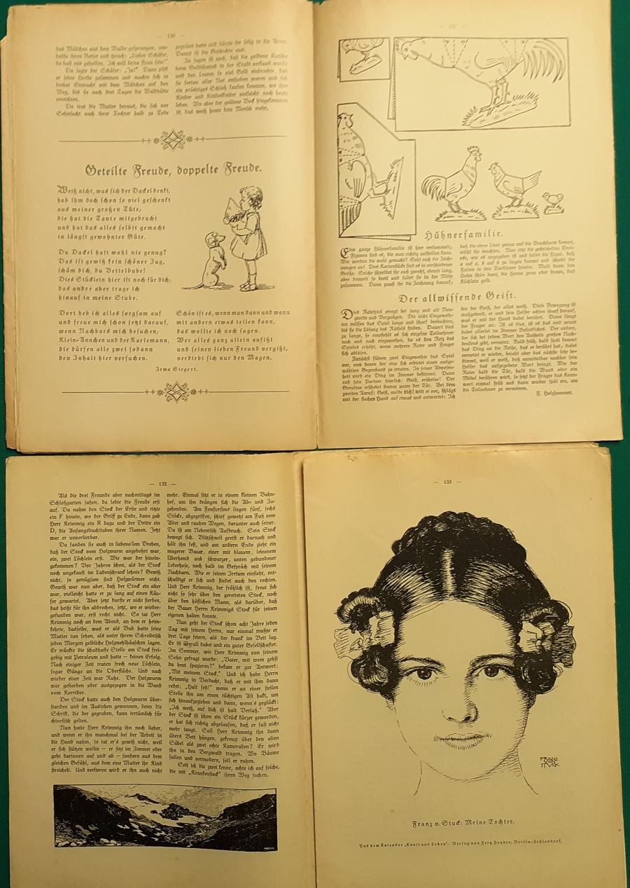 Hrsg. Bayerischer Lehrerverein, Nürnberg; es handelt sich um halbmonatlich erscheinende 16 Seiten umfassende Schriften im Format 25 x 17 cm; mit sehr schönen Bildern namhafter Illustratoren, z.B. Else Wenz-Vietor, Hermann Stockmann, Carl Storch, Ernst Kreidolf u.a. Rubriken: Erzählungen, Märchen, Sagen, Briefe - Gedichte, Noten - Belehrendes - Zur Beschäftigung - Rätsel und Scherz - Kunstbeilagen - Aufführungen |