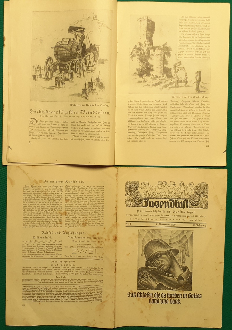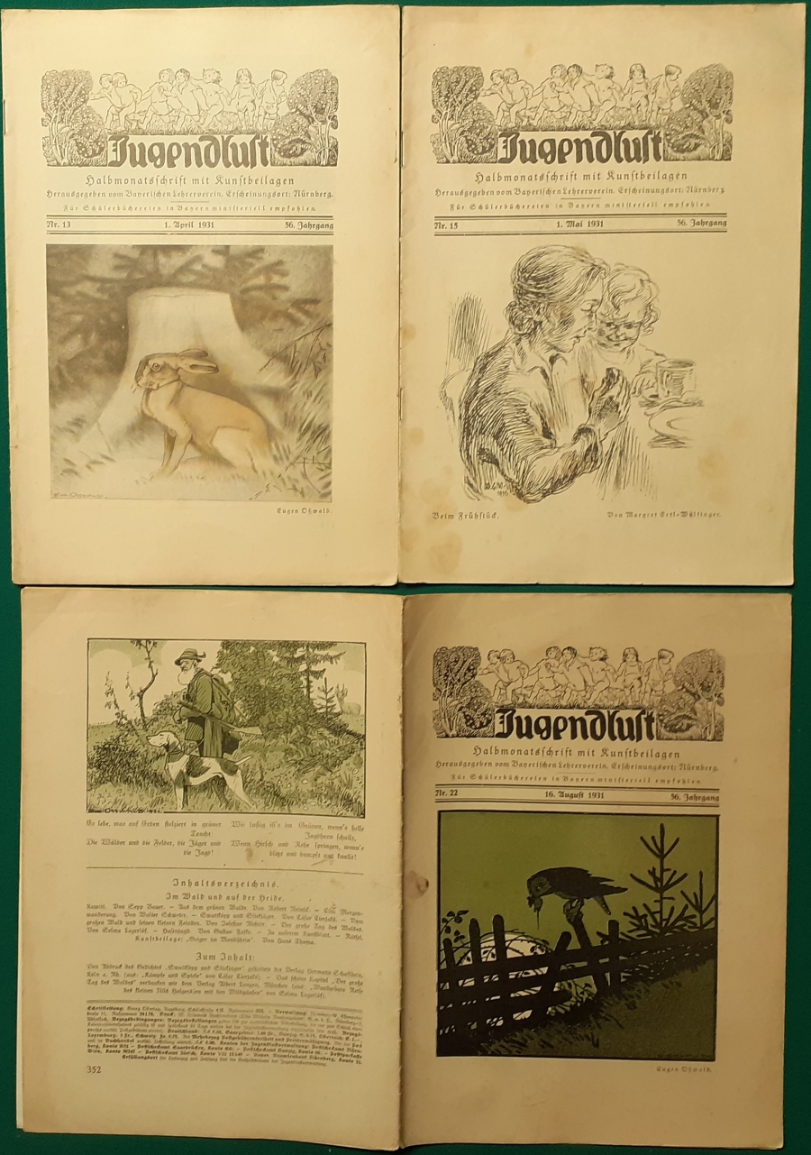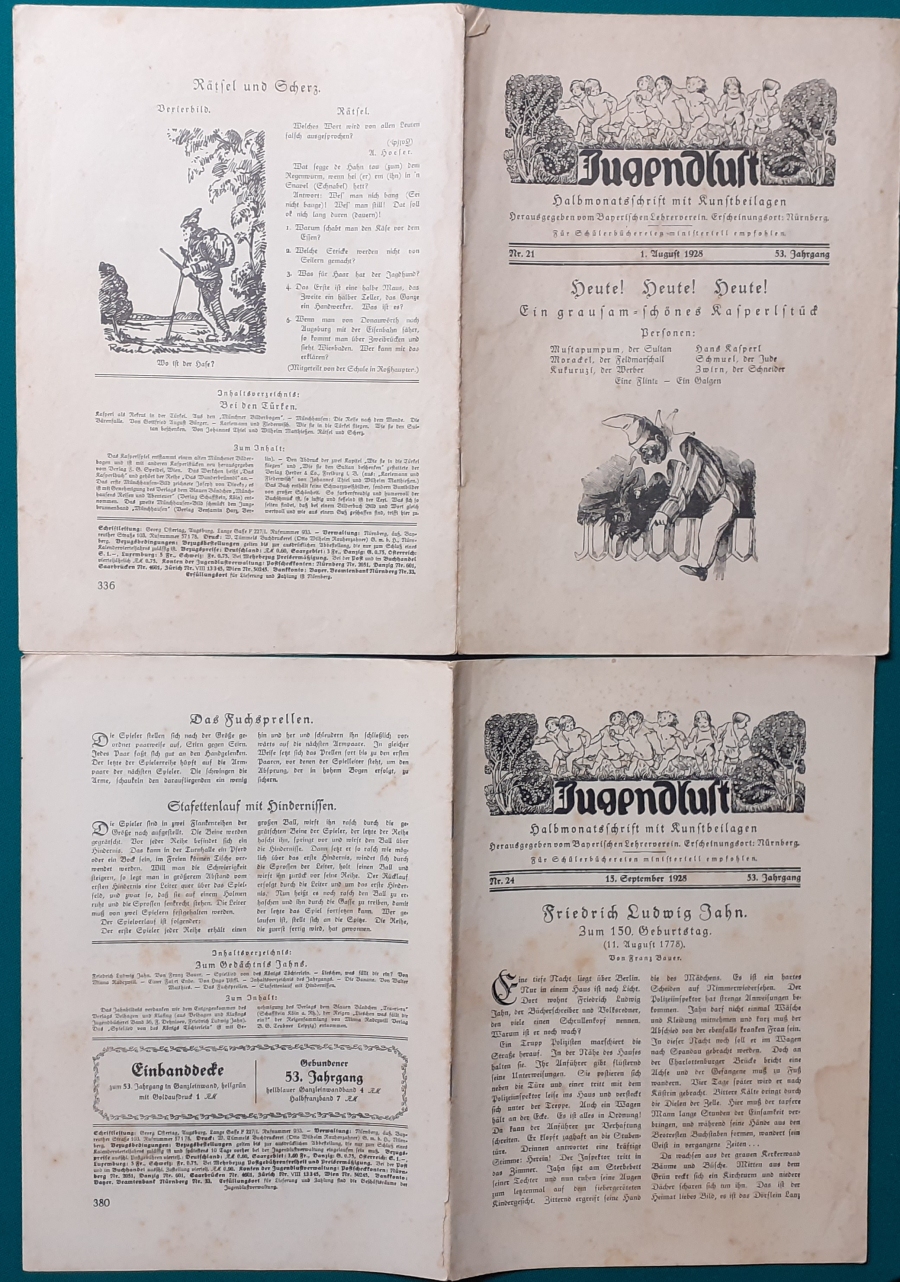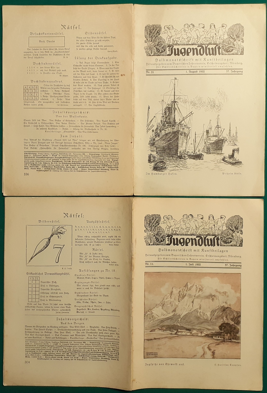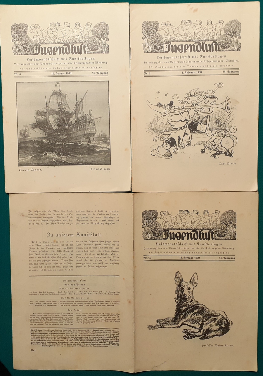 Hrsg. Bayerischer Lehrerverein, Nürnberg; es handelt sich um halbmonatlich erscheinende 16 Seiten umfassende Schriften im Format 25 x 17 cm; mit sehr schönen Bildern namhafter Illustratoren, z.B. Else Wenz-Vietor, Hermann Stockmann, Carl Storch, Ernst Kreidolf u.a. Rubriken: Erzählungen, Märchen, Sagen, Briefe - Gedichte, Noten - Belehrendes - Zur Beschäftigung - Rätsel und Scherz - Kunstbeilagen - Aufführungen |