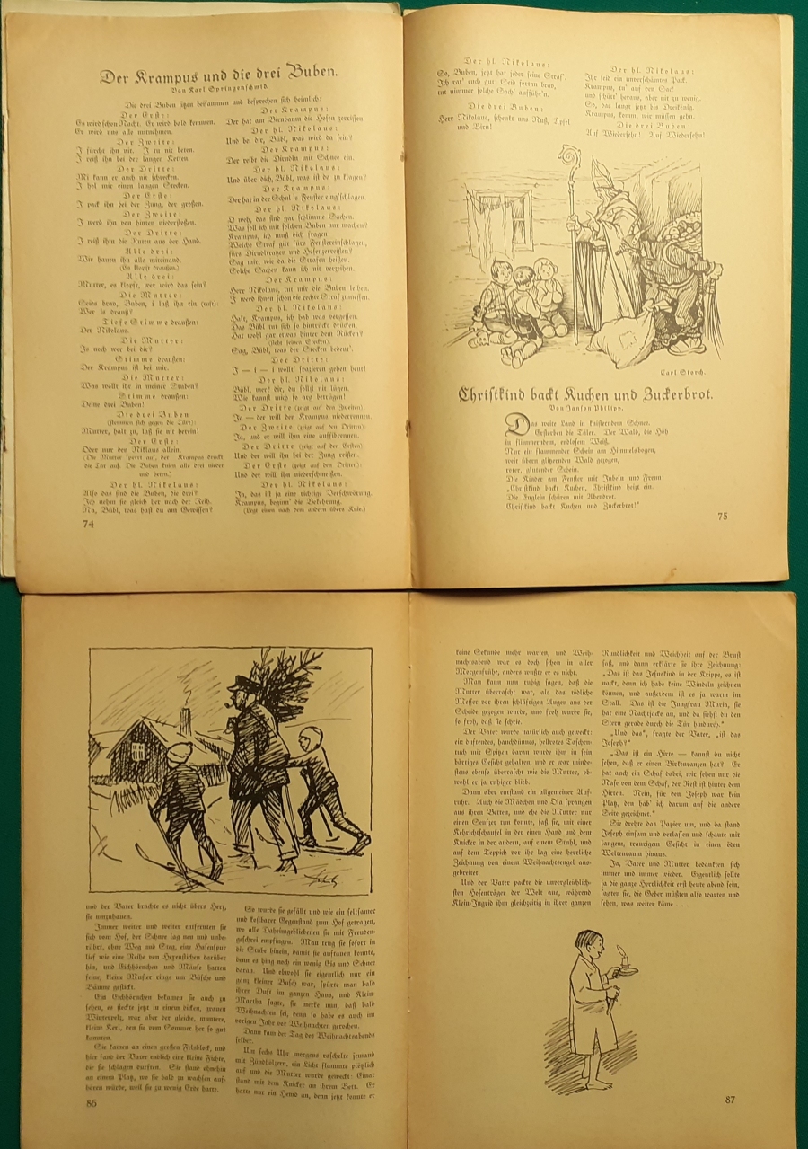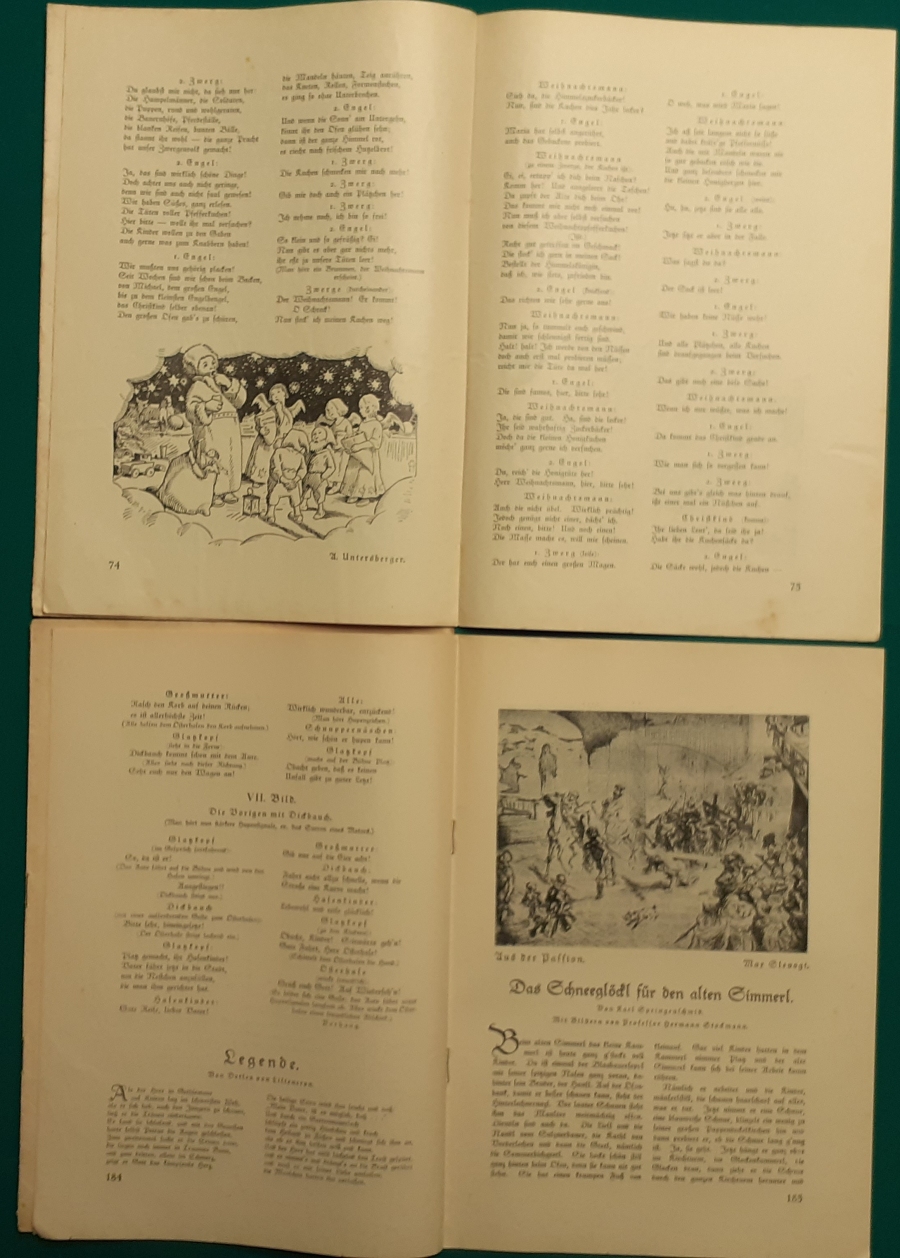 Kurt Arnold Findeisen mit Zeichnungen von Maria Braun: Ihr Kinderlein kommet; Hans Watzlik: Wunder der Weihnacht; Johann Meixner mit Bildern von E. Steigerwaldt: Christkinds Erdenfahrt; Hans Grimm: Im Gefangenenlager in Dahomey; Angelina Claus-Knoop mit Bild von Jo Franziß: Das Neue Licht |