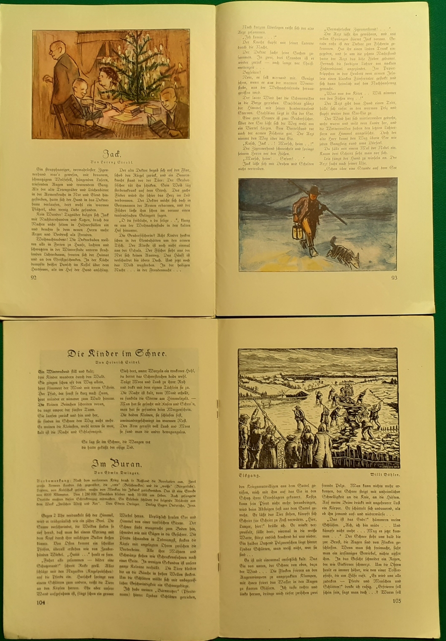 Marie Hamsun: Der Wettlauf; Otto Kögl mit Zeichnungen von Toni Schönecker: Die Jugend startet; Georg Ruseler mit Abbildungen von Emil Preetorius: Der Schlitten; Heinrich Lersch: Es schneit |
