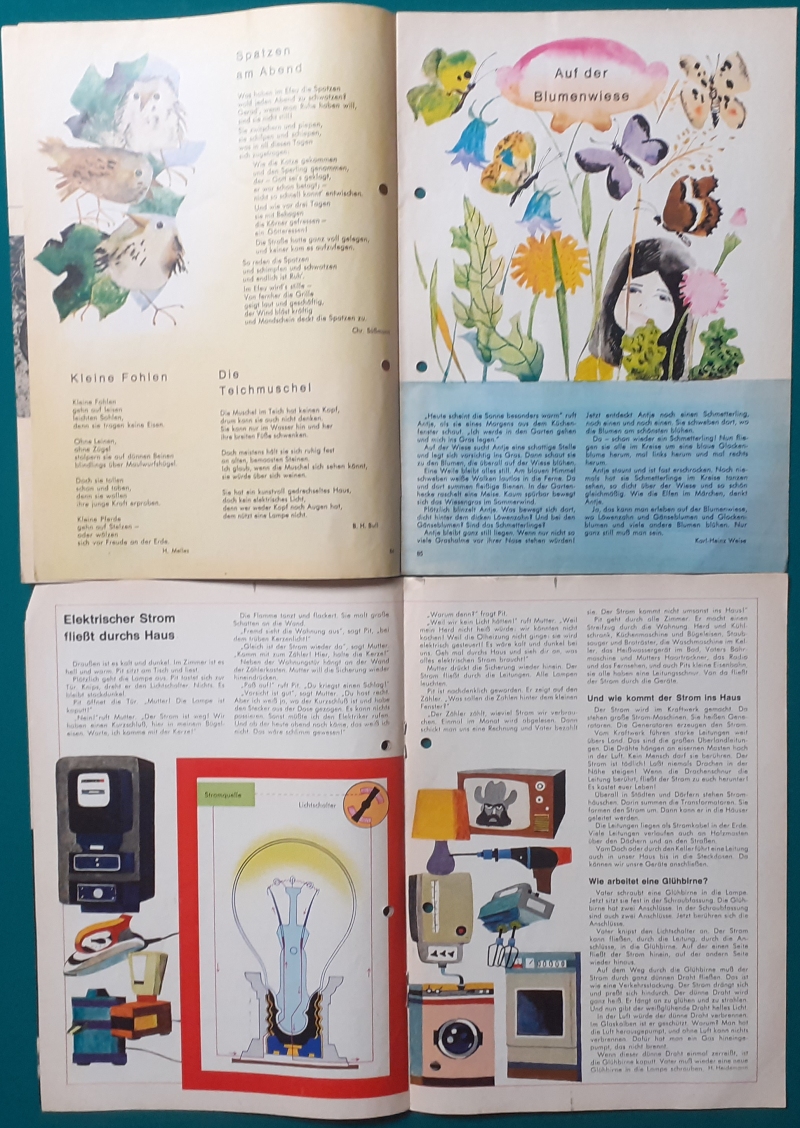 Die Blindschleiche ist keine Schlange; Christel Süßmann: Spatzen am Abend; Karl-Heinz Weise: Auf der Blumenwiese; Heide Heidemann: Wie kommt das Wasser in die Leitung (Erklärung des Wasserkreislaufes); Irmgard Duschek: Trops, Traps und Trips gehen auf die Reise; Pieter ... (5. Teil) | seitlich gelocht, hintere Umschlagseite fehlt leider; sonst guter altersgemäßer Zustand | 2 |