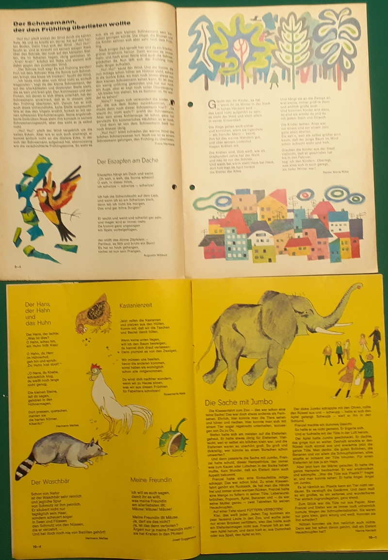 Tiere der Nacht; Meine Freundin v. Josef Guggenmos; Die Sache mit Jumbo v. Hanna Hanisch; Franz hat einen Vogel v. Gerhard Ziegler; Das Buchstaben-Würfelspiel; Woher kommen unsere Haustiere?; Allerlei Verkehrszeichen; Das Fahrtenmesser v. Gisela Schütz; Der Hase mit dem roten Fell v. Helmut Hochrain; Wir malen mit der Zahnbürste | guter altersgemäßer Zustand | 4 |