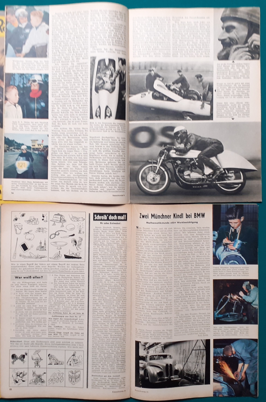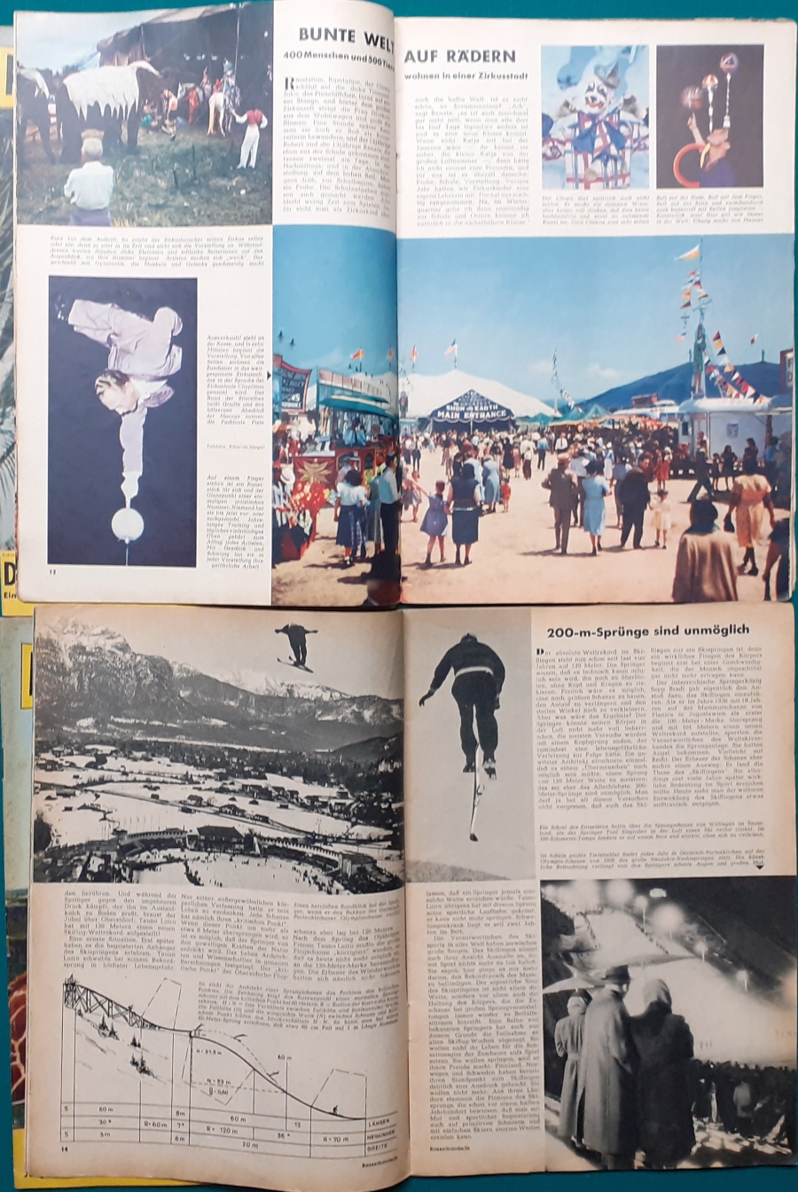 | 17 | Der Beruf des Tauchers; Zu Besuch bei einem Jungen im Shigartal (Karakorum); Die Fernsehansagerin Irene Koss; Das größte Barometer der Welt in London; Der Ur-Stammbaum der Tiere; Wasserzeichen in der Geschichtsforschung; Wiederankunft der Störche in Deutschland nach den Wintermonaten; Über den 35jährigen Stanley Matthews; Spieltaktik beim Handball; Die Reiterin Pat Smythe; Die Weitspringerin Hildrun Claus; Erregende Kriminalfälle und ihre dramatische Aufklärung; Technische Wunderwerke waren die Wasserleitungen des Altertums | Einband leicht bestoßen; sonst sauber und gepflegt; recht guter altersgemäßer Zustand | 5 |