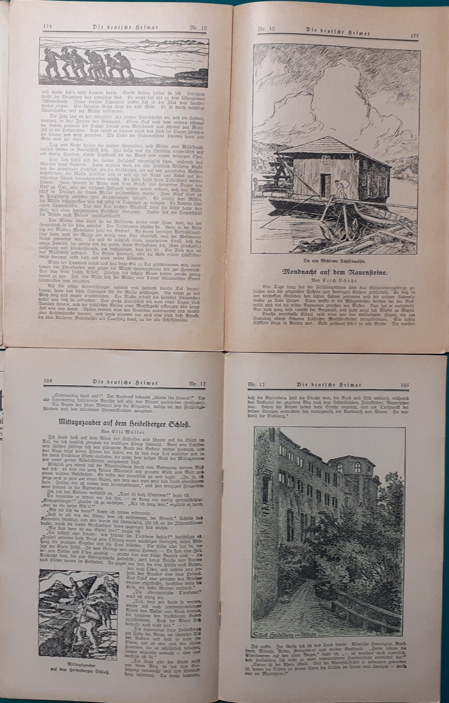 | 12 / März 1929 | Anna Schaab: Homo Heidelbergensis; Der Sommertag in Heidelberg; Else Müller: Mittagszauber auf dem Heidelberger Schloß; W. O. von Horn: Der wackere Schiffer aus Neckargemünd; Das Teufenmännle; Anton Birlinger: Der Mondfanger und Stangenstrecker; Der steinerne Brotlaib | guter altersgemäßer Zustand | 4 |