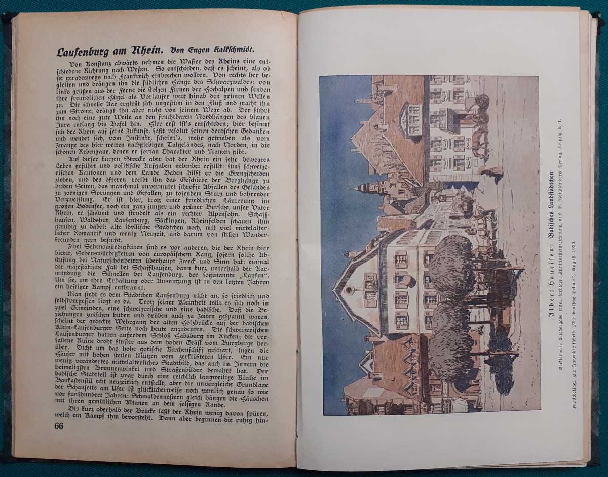 | K. Fitzer: Etwas von der Besiedlung des Waldenburger Berglandes; W. Werner: Die Lohequellen; An der Wiege der Saale; A. Reichhold: Der Reiter im Zeitelmoos; J. Lichtherz: Der Engelsberg; H. W. Müller: Wie ich die Ostmark sah; Ostpreußische Volksbräuche am Silvestertag; Eine Sage aus dem Memellande; Zwei Sagen aus Masuren; Eugen Kalkschmid: Lausenburg am Rhein; Aloys Geistbeck: Die sonnige Pfalz; Elisabeth Rock: Die Gründung von Karlsruhe; C. Andervaater: Bilder aus einem Heidedorf; L. Anders: Das Nahetal; Karl Geib: die Geschichte der Nahe; Fr. Storch: die Gründung des Klosters Disibodenberg .... | Leinenrücken mit sehr festem Hartpappeinband; Buch komplett mit Buntpapier überklebt; leicht an den Buchkanten bestoßen; sauberer Buchschnitt; Zustand altersgemäß gut: normale Papiergilbung und insgesamt gepflegt | 12 |