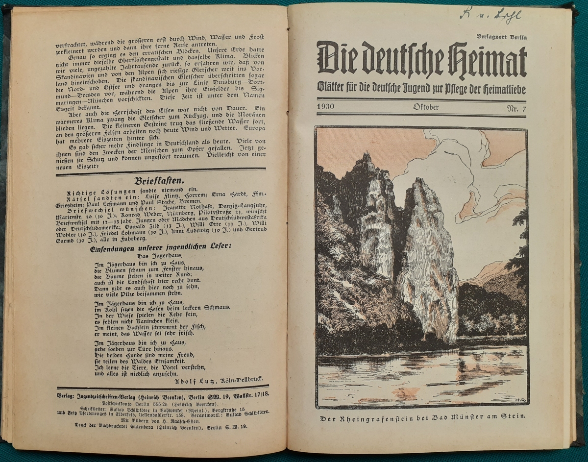 | 7 / Oktober 1928 | Clara Viebig: Im hohen Venn; Heinz Franke: Im Brohltal; Der Affe zu Dhaun; Der Raubritter am Laacher See; Der Schäfer am Pulvermaar; Der Kartstein; Der Kobold im Weinberg | Umschlag beschädigt und mit Tesafilm befestigt; sonst ok. und befriedigender altersgemäßer Zustand | 2 |