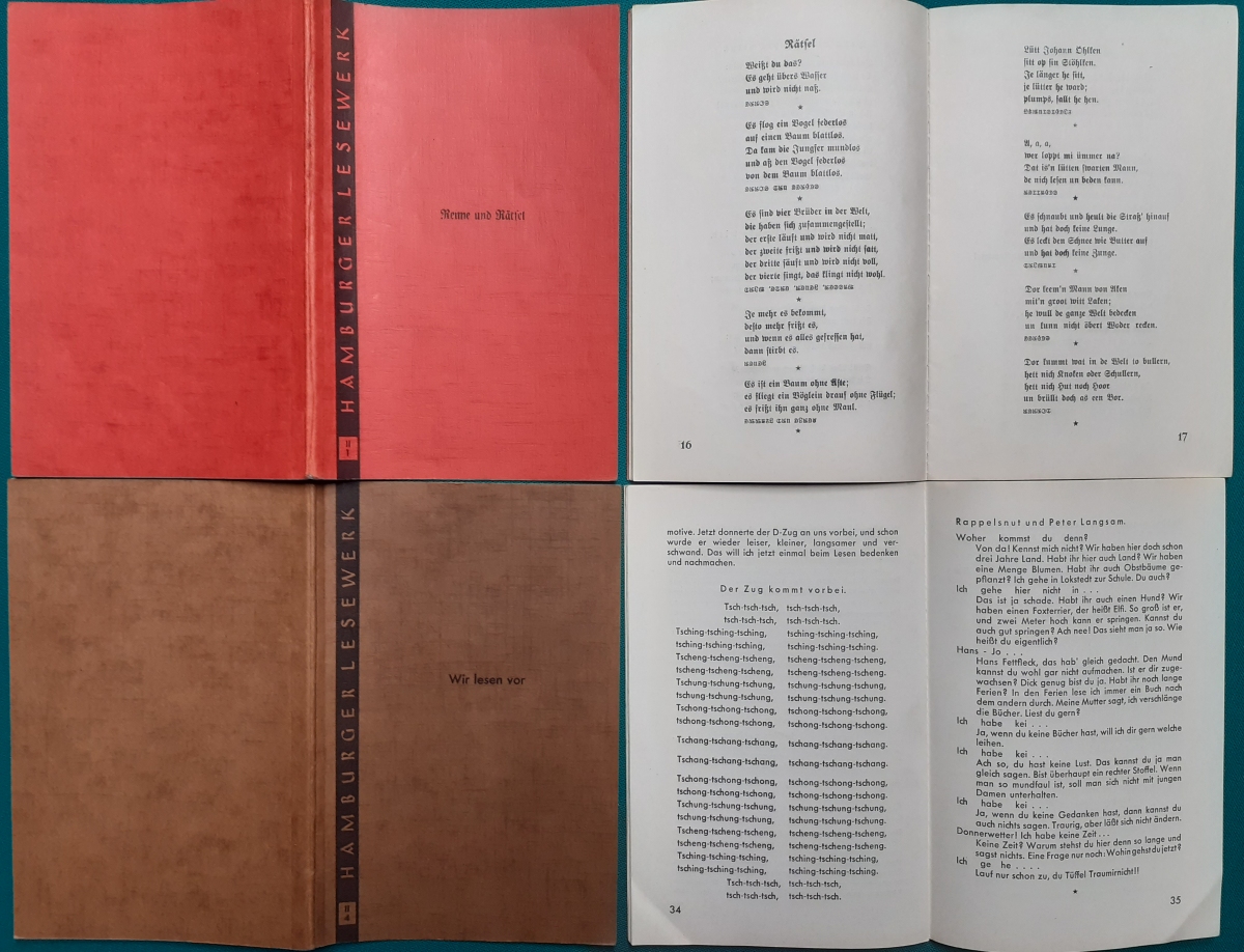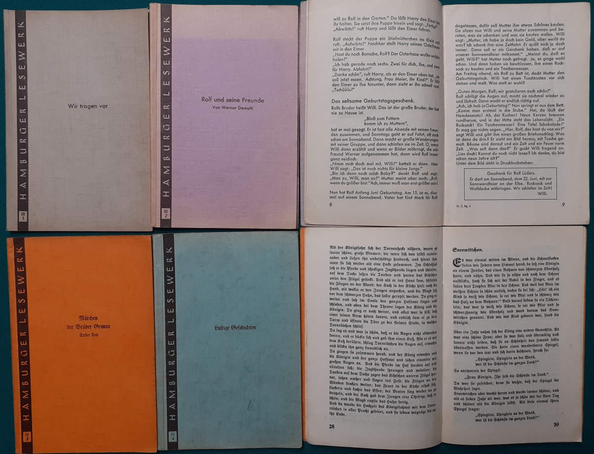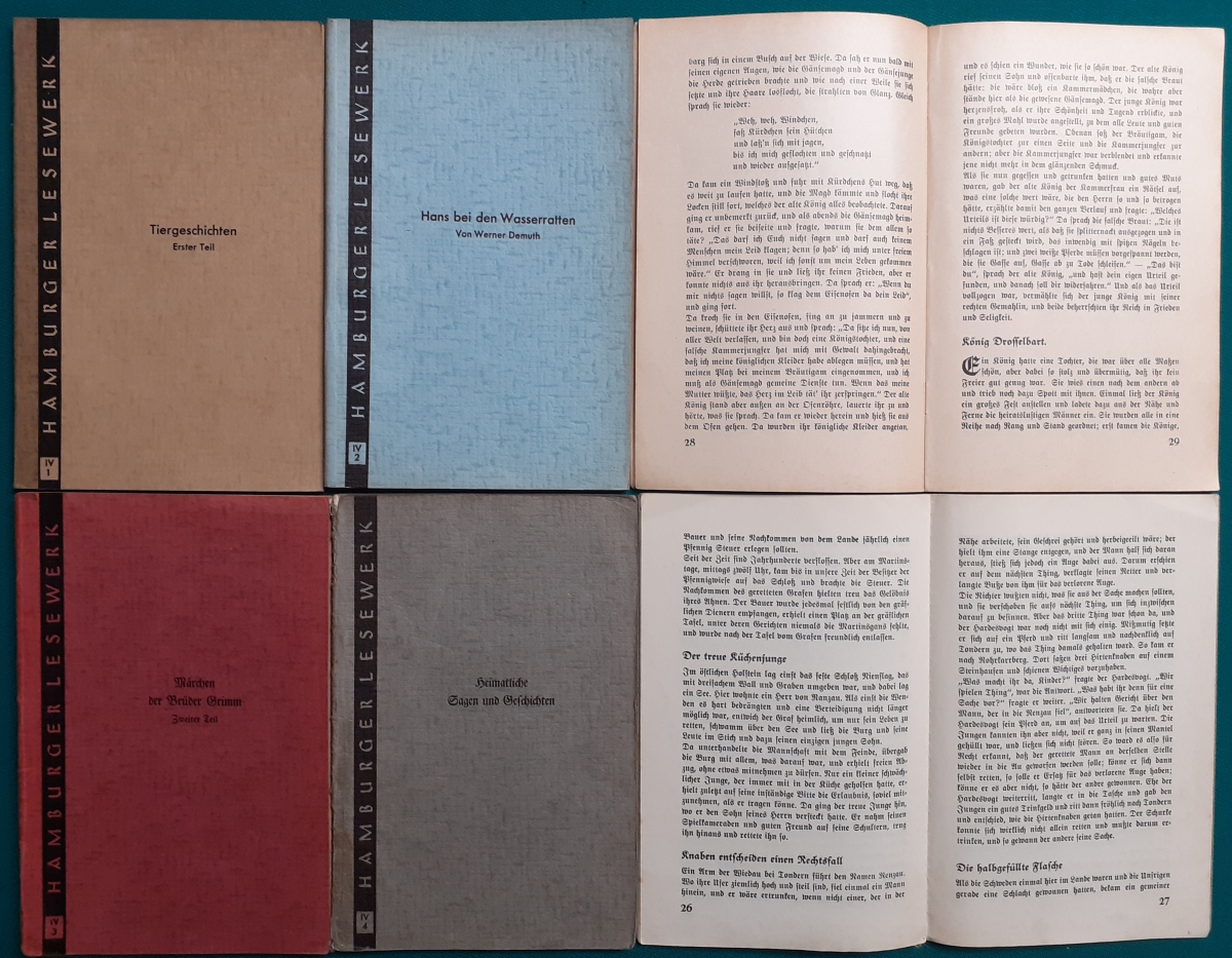 Lesehefte (siehe auch dort) Hrsg. Gesellschaft der Freunde des vaterländischen Schul- und Erziehungswesens in Hamburg. Das Format ist jeweils 19 x 12,5 cm. Es handelt sich um Hefte für Kinder der Grundschule - aufgeteilt nach den Schuljahren 2 bis 5. Die Hefte erschienen in den 1950er Jahren. |