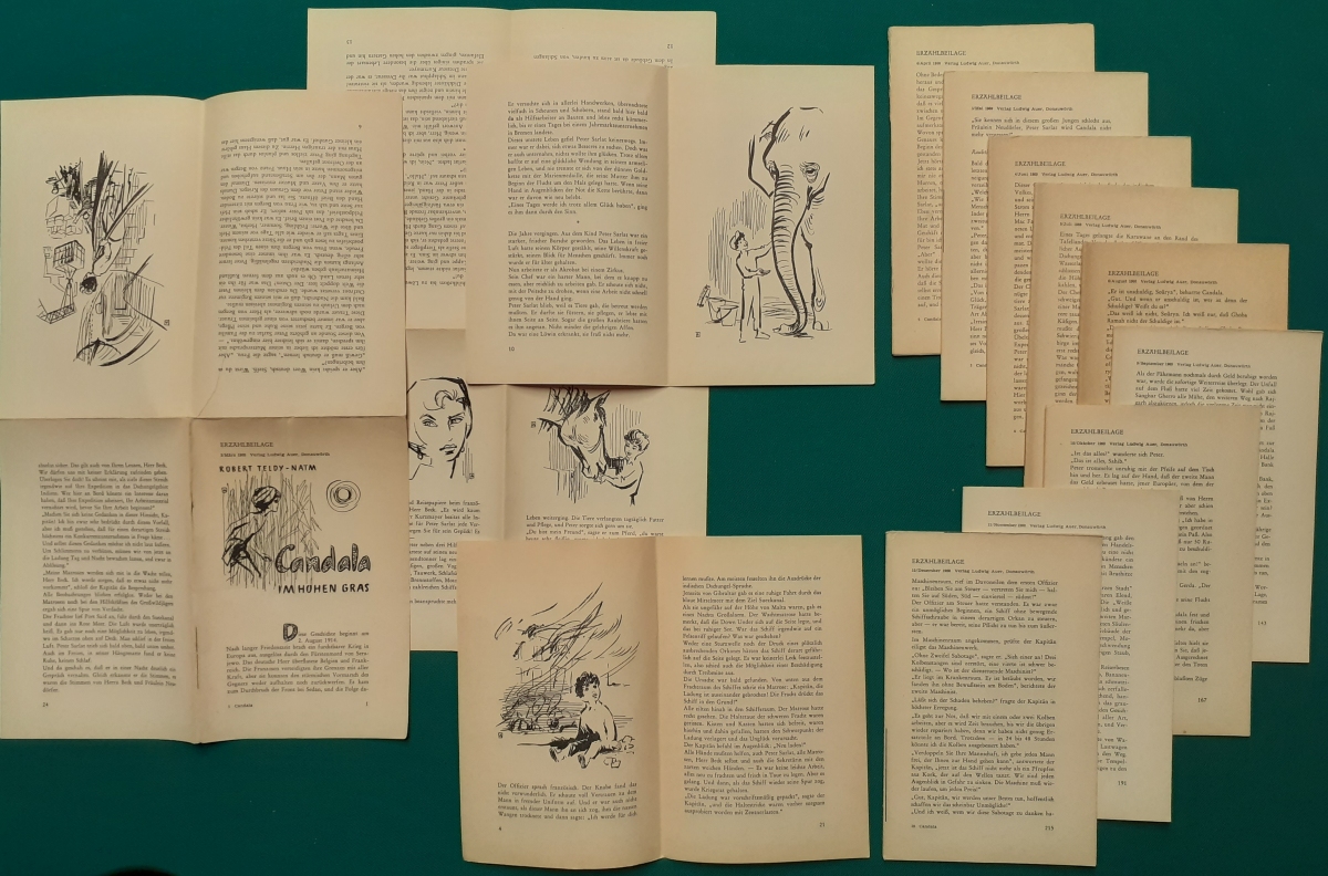 Erzählbeilage 1: März 1960 bis Dezember 1960 in 10 Fortsetzungen erschienen Robert Teldy-Natm: Candala im hohen Gras Ludwig Auer Verlag; insgesamt 238 Seiten in 10 Beilagen, vollständige Beilagensammlung in gutem altersgemäßen Zustand, Preis: 6 EUR |