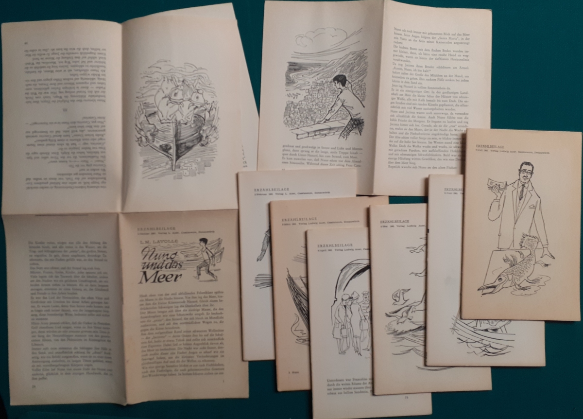 Erzählbeilage 2: Januar 1961 bis Juli 1961 in 7 Fortsetzungen erschienen L. N. Lavolle: Nuno und das Meer Ludwig Auer Verlag; insgesamt 168 Seiten in 7 Beilagen, vollständige Beilagensammlung in gutem altersgemäßen Zustand, Preis: 6 EUR |