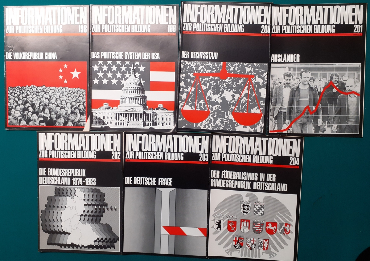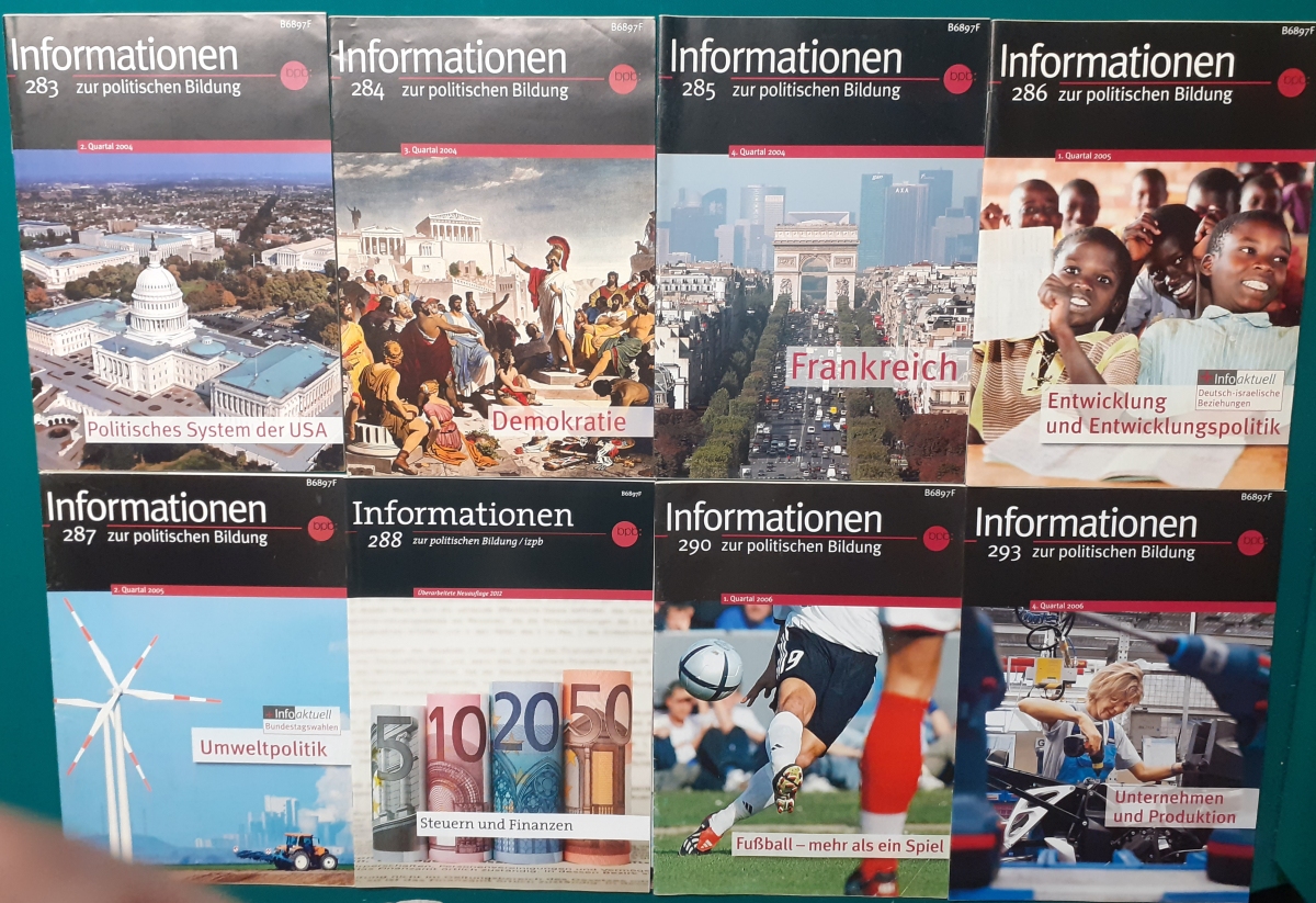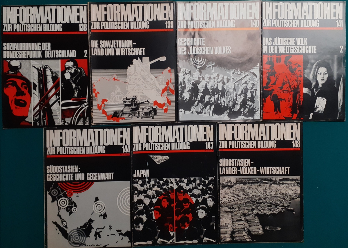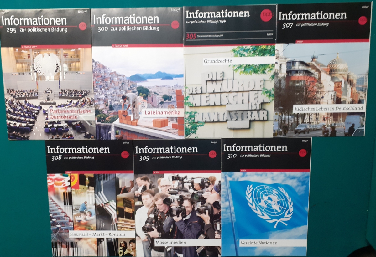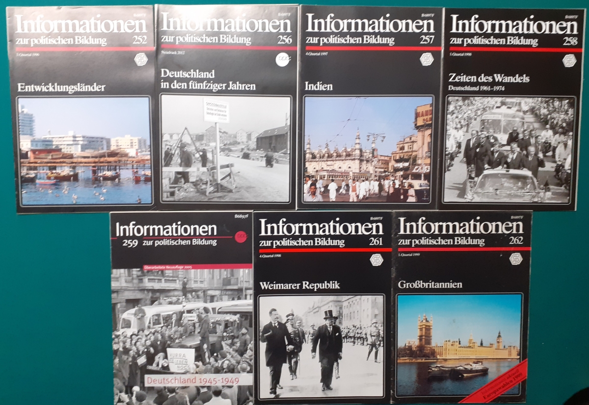 Herausgeber: Bundeszentrale für Heimatdienst; seit 1963 Bundeszentrale für politische Bildung in Bonn. Die Hefte sind unter anderem "für die Hand des Lehrers" konzipiert worden. Es handelt sich um Hefte im Format 30 x 21 cm in unterschiedlichem Umfang - anfangs zwischen 20 und 40 Seiten, in den letzten Jahren 60 Seiten und mehr. Jedes Heft behandelt ein spezielles Themengebiet, zum dem umfangreiches statistisches und Bild- und Kartenmaterial gezeigt wird. Da die Hefte sich an den Politik-Unterricht an unseren Schulen richten, sind die Themen an den Inhalten der Bildungspläne der Bundesländern orientiert. Jedes Heft bringt am Ende umfangreiche Literaturhinweise. In einigen Bänden ist außerdem die Rubrik "Das Thema im Unterricht" mit Überlegungen zur methodischen und didaktischen Unterrichtsgestaltung enthalten. Außerdem sind vor allem in den 2000er Jahre ständig Hefte zu aktuellem Geschehen herausgekommen. Diese ohne Nummer erschienenen Hefte sind in die folgende Tabelle zum Jahr ihres Erscheinens integriert worden. Die Hefte haben einen guten altersgemäßen Zustand und sind weitgehend unbenutzt. |