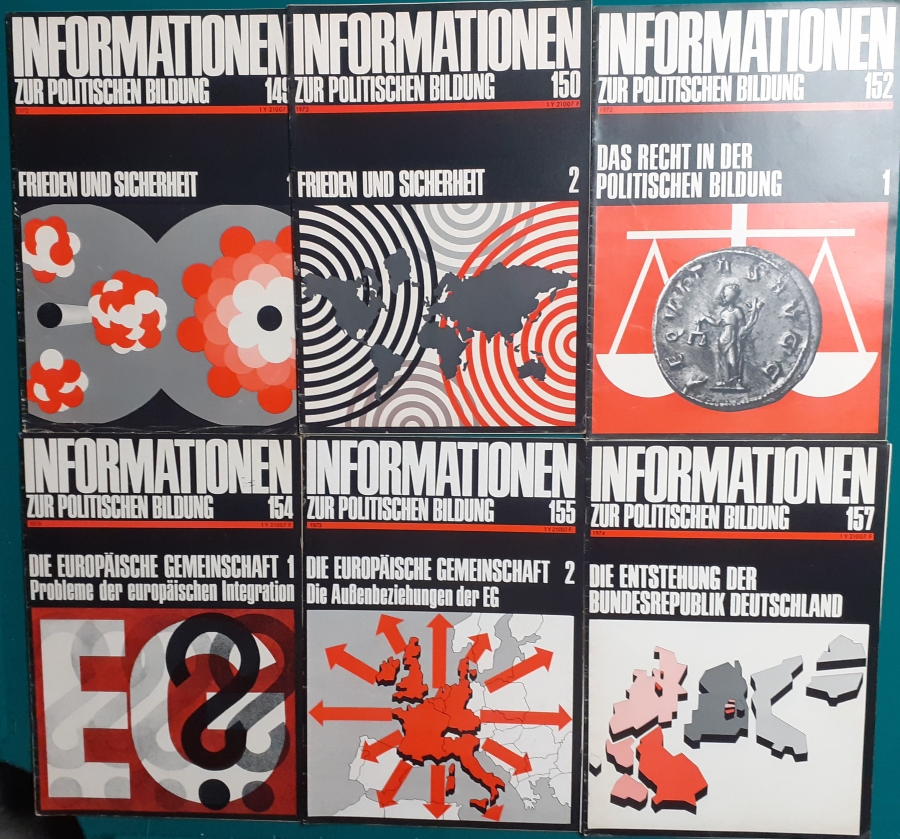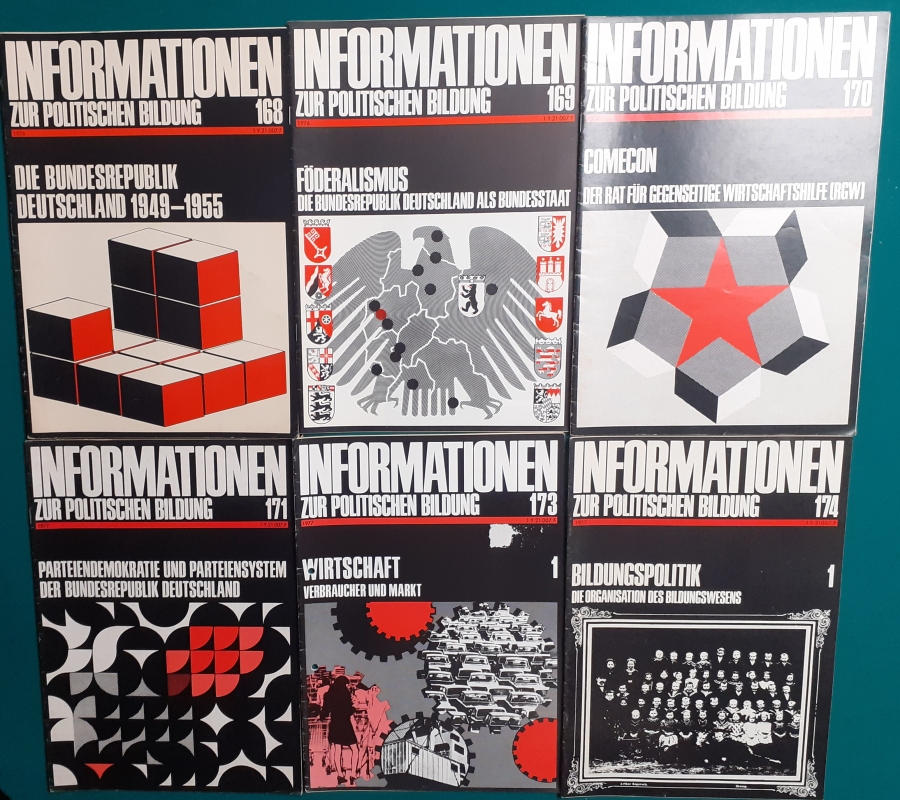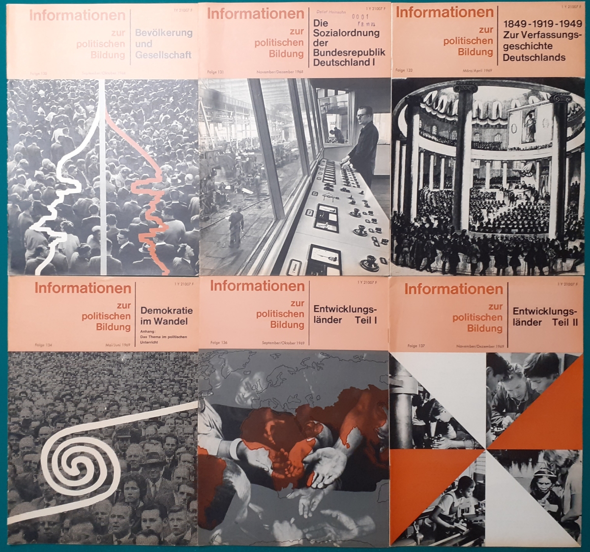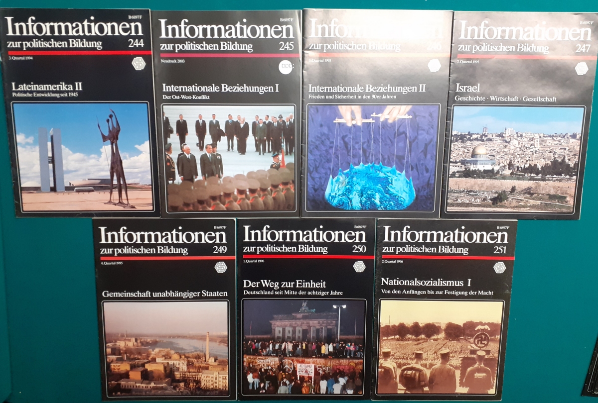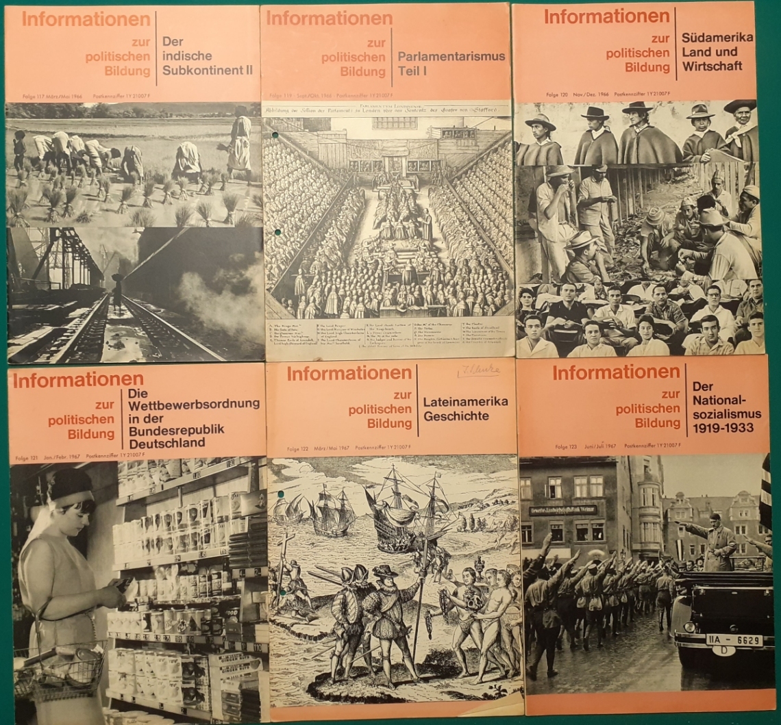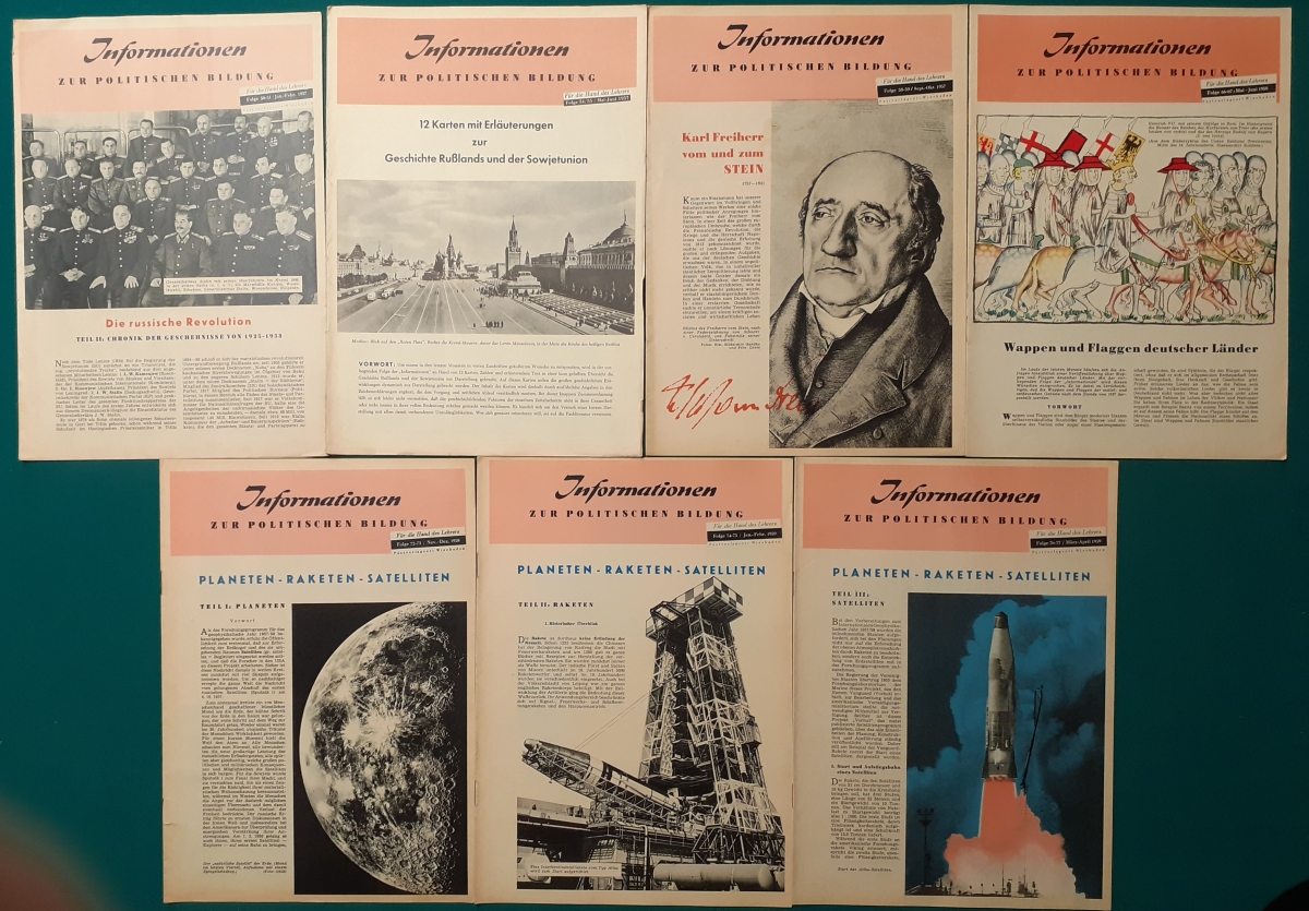 Herausgeber: Bundeszentrale für Heimatdienst; seit 1963 Bundeszentrale für politische Bildung in Bonn. Die Hefte sind unter anderem "für die Hand des Lehrers" konzipiert worden. Es handelt sich um Hefte im Format 30 x 21 cm in unterschiedlichem Umfang - anfangs zwischen 20 und 40 Seiten, in den letzten Jahren 60 Seiten und mehr. Jedes Heft behandelt ein spezielles Themengebiet, zum dem umfangreiches statistisches und Bild- und Kartenmaterial gezeigt wird. Da die Hefte sich an den Politik-Unterricht an unseren Schulen richten, sind die Themen an den Inhalten der Bildungspläne der Bundesländern orientiert. Jedes Heft bringt am Ende umfangreiche Literaturhinweise. In einigen Bänden ist außerdem die Rubrik "Das Thema im Unterricht" mit Überlegungen zur methodischen und didaktischen Unterrichtsgestaltung enthalten. Außerdem sind vor allem in den 2000er Jahre ständig Hefte zu aktuellem Geschehen herausgekommen. Diese ohne Nummer erschienenen Hefte sind in die folgende Tabelle zum Jahr ihres Erscheinens integriert worden. Die Hefte haben einen guten altersgemäßen Zustand und sind weitgehend unbenutzt. |