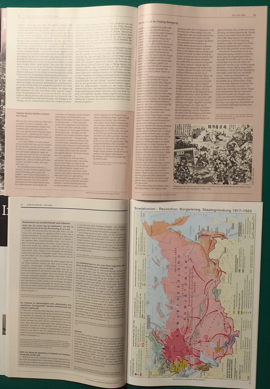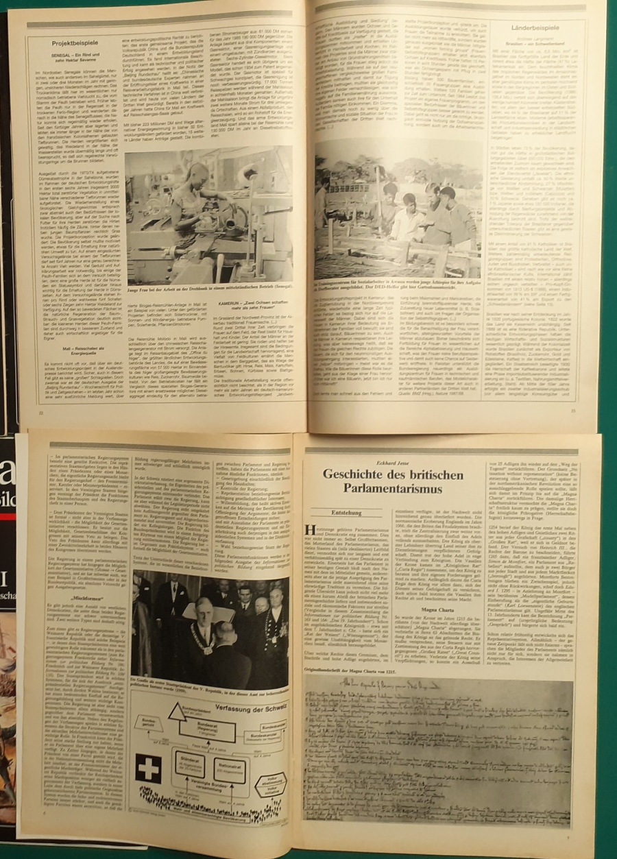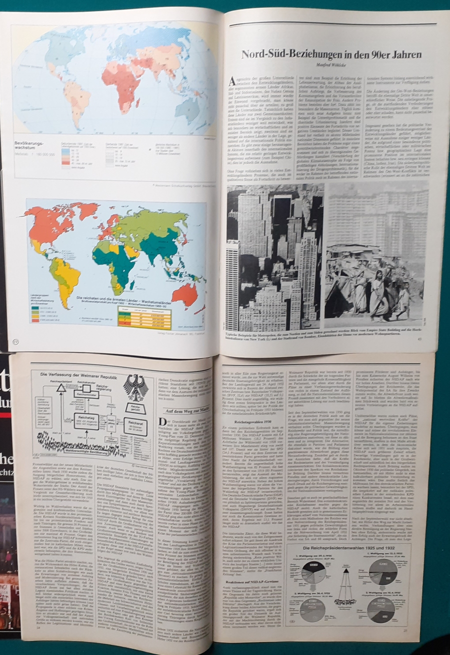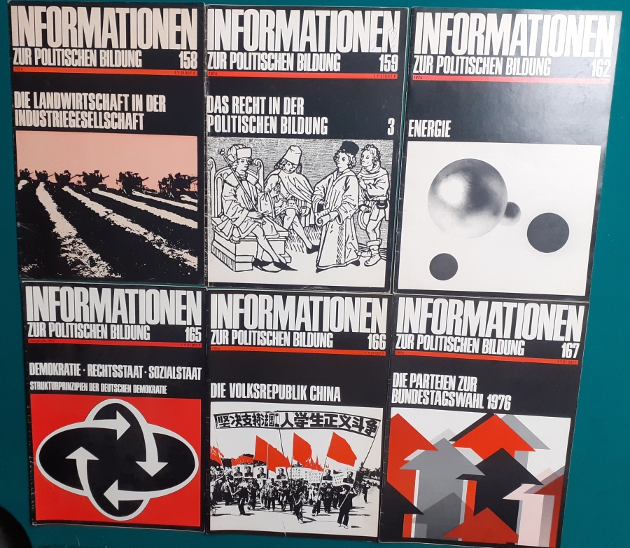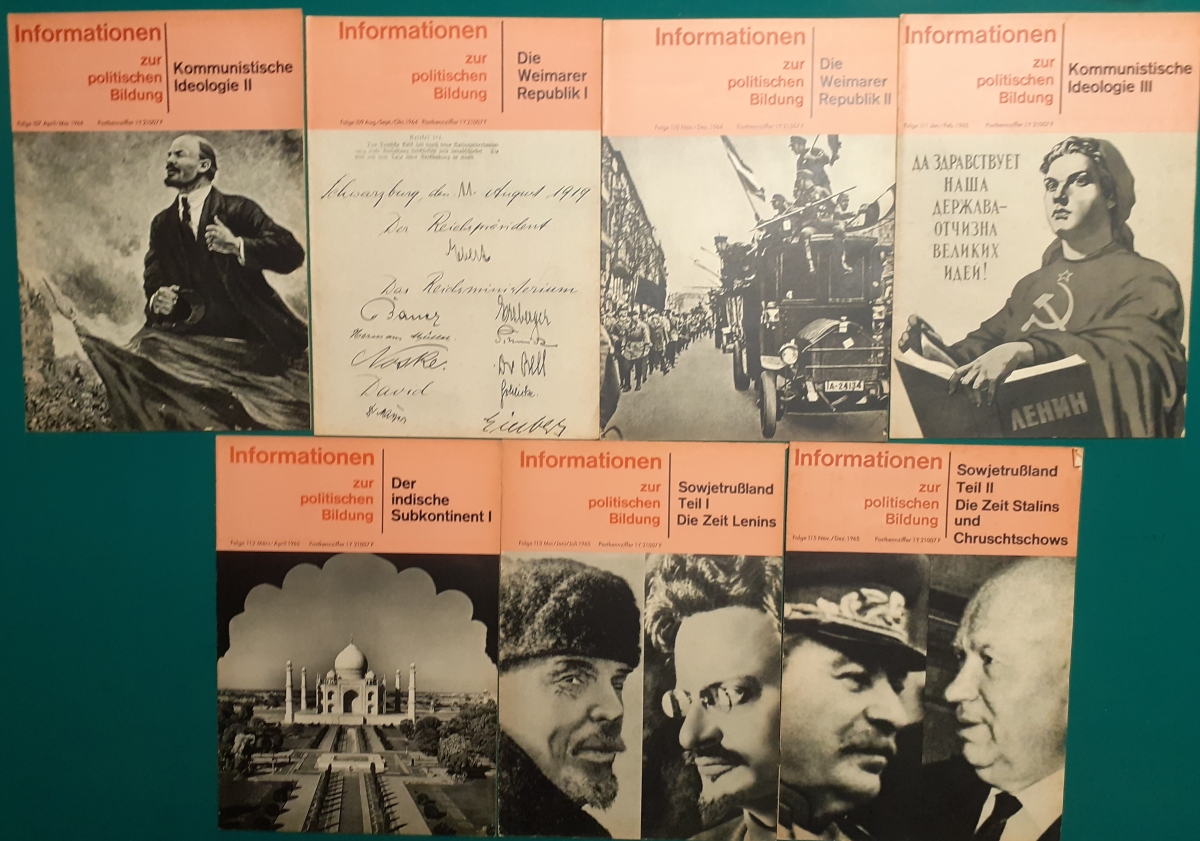 Herausgeber: Bundeszentrale für Heimatdienst; seit 1963 Bundeszentrale für politische Bildung in Bonn. Die Hefte sind unter anderem "für die Hand des Lehrers" konzipiert worden. Es handelt sich um Hefte im Format 30 x 21 cm in unterschiedlichem Umfang - anfangs zwischen 20 und 40 Seiten, in den letzten Jahren 60 Seiten und mehr. Jedes Heft behandelt ein spezielles Themengebiet, zum dem umfangreiches statistisches und Bild- und Kartenmaterial gezeigt wird. Da die Hefte sich an den Politik-Unterricht an unseren Schulen richten, sind die Themen an den Inhalten der Bildungspläne der Bundesländern orientiert. Jedes Heft bringt am Ende umfangreiche Literaturhinweise. In einigen Bänden ist außerdem die Rubrik "Das Thema im Unterricht" mit Überlegungen zur methodischen und didaktischen Unterrichtsgestaltung enthalten. Außerdem sind vor allem in den 2000er Jahre ständig Hefte zu aktuellem Geschehen herausgekommen. Diese ohne Nummer erschienenen Hefte sind in die folgende Tabelle zum Jahr ihres Erscheinens integriert worden. Die Hefte haben einen guten altersgemäßen Zustand und sind weitgehend unbenutzt. |