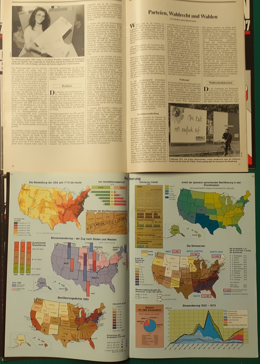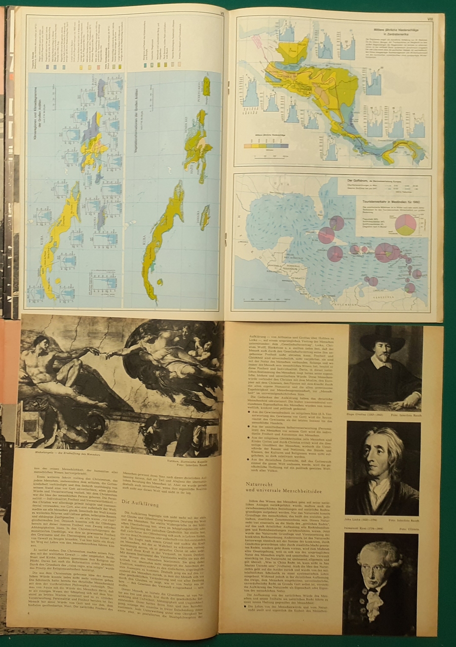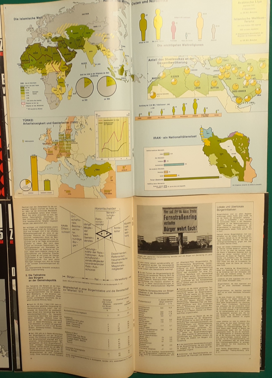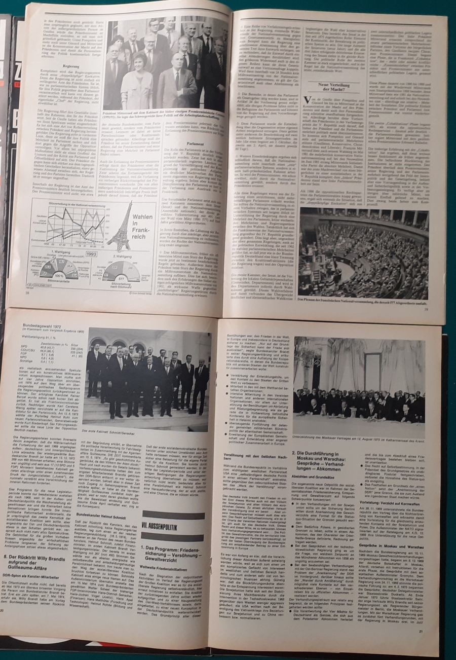 Herausgeber: Bundeszentrale für Heimatdienst; seit 1963 Bundeszentrale für politische Bildung in Bonn. Die Hefte sind unter anderem "für die Hand des Lehrers" konzipiert worden. Es handelt sich um Hefte im Format 30 x 21 cm in unterschiedlichem Umfang - anfangs zwischen 20 und 40 Seiten, in den letzten Jahren 60 Seiten und mehr. Jedes Heft behandelt ein spezielles Themengebiet, zum dem umfangreiches statistisches und Bild- und Kartenmaterial gezeigt wird. Da die Hefte sich an den Politik-Unterricht an unseren Schulen richten, sind die Themen an den Inhalten der Bildungspläne der Bundesländern orientiert. Jedes Heft bringt am Ende umfangreiche Literaturhinweise. In einigen Bänden ist außerdem die Rubrik "Das Thema im Unterricht" mit Überlegungen zur methodischen und didaktischen Unterrichtsgestaltung enthalten. Außerdem sind vor allem in den 2000er Jahre ständig Hefte zu aktuellem Geschehen herausgekommen. Diese ohne Nummer erschienenen Hefte sind in die folgende Tabelle zum Jahr ihres Erscheinens integriert worden. Die Hefte haben einen guten altersgemäßen Zustand und sind weitgehend unbenutzt. |