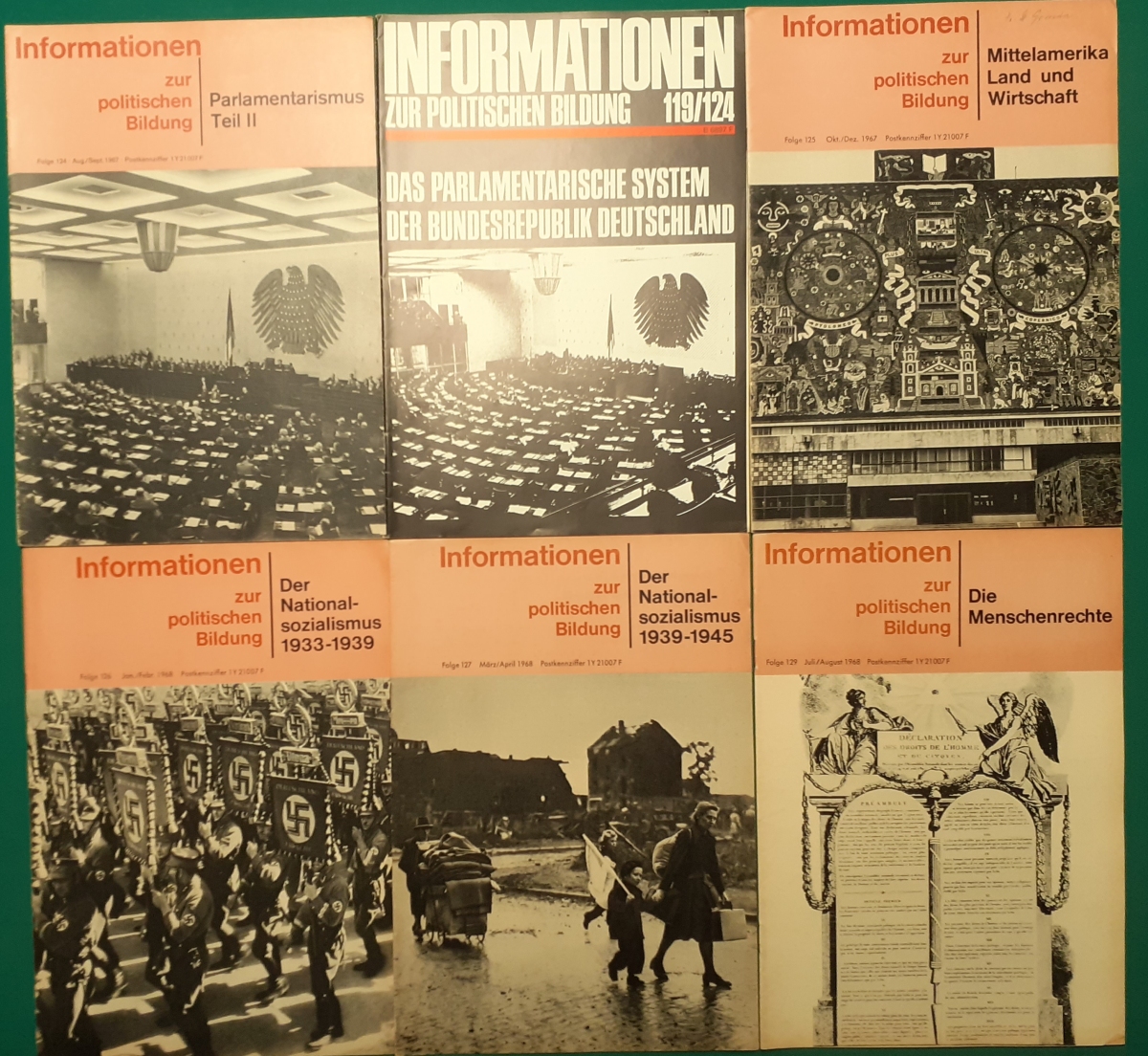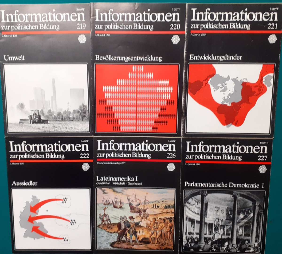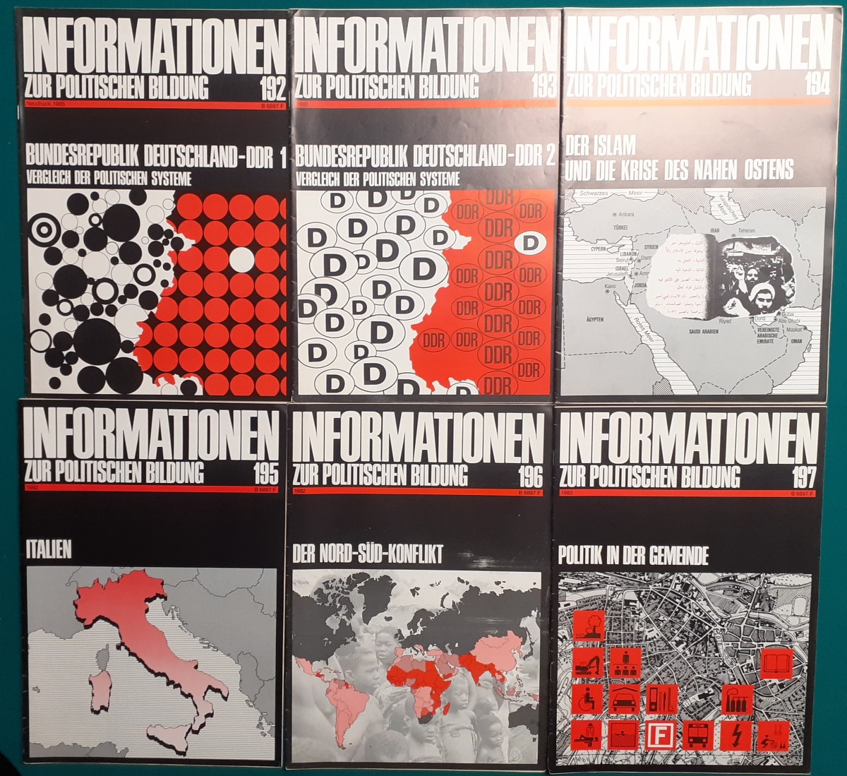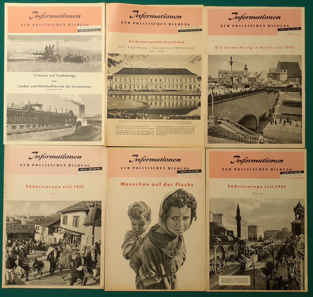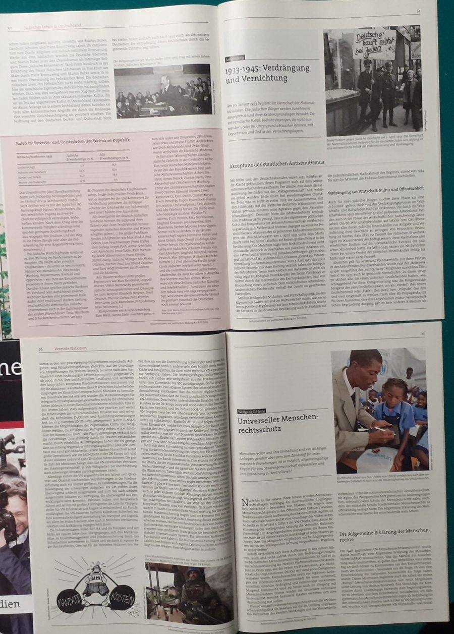 Herausgeber: Bundeszentrale für Heimatdienst; seit 1963 Bundeszentrale für politische Bildung in Bonn. Die Hefte sind unter anderem "für die Hand des Lehrers" konzipiert worden. Es handelt sich um Hefte im Format 30 x 21 cm in unterschiedlichem Umfang - anfangs zwischen 20 und 40 Seiten, in den letzten Jahren 60 Seiten und mehr. Jedes Heft behandelt ein spezielles Themengebiet, zum dem umfangreiches statistisches und Bild- und Kartenmaterial gezeigt wird. Da die Hefte sich an den Politik-Unterricht an unseren Schulen richten, sind die Themen an den Inhalten der Bildungspläne der Bundesländern orientiert. Jedes Heft bringt am Ende umfangreiche Literaturhinweise. In einigen Bänden ist außerdem die Rubrik "Das Thema im Unterricht" mit Überlegungen zur methodischen und didaktischen Unterrichtsgestaltung enthalten. Außerdem sind vor allem in den 2000er Jahre ständig Hefte zu aktuellem Geschehen herausgekommen. Diese ohne Nummer erschienenen Hefte sind in die folgende Tabelle zum Jahr ihres Erscheinens integriert worden. Die Hefte haben einen guten altersgemäßen Zustand und sind weitgehend unbenutzt. |