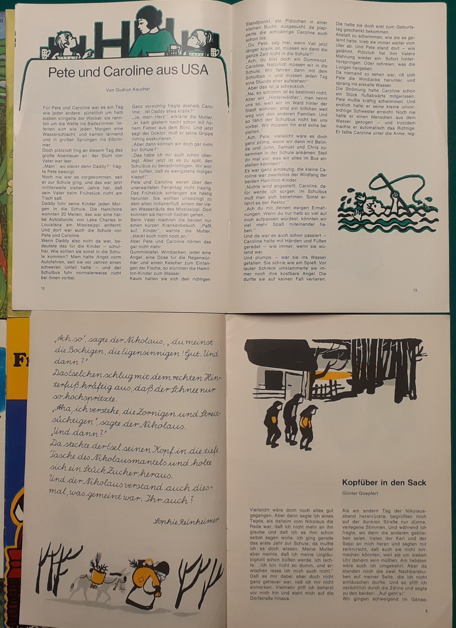 9 / 1971 | Kasperl geht in die Schule (Schreibschrift); Der kleine Jan und die Schultüte v. Irina Korschunow; Die Schule im Schlaraffenland v. Franz Bauer; Pete und Caroline aus USA v. Gudrun Keucher, Delphinen-Schule v. Cornelia Mensching | Schöne Illustrationen von Ulla Scholl; Umfang 20 Seiten - normal geheftet; Heftkanten etwas bestoßen; guter altersgemäßer Zustand | 3 |