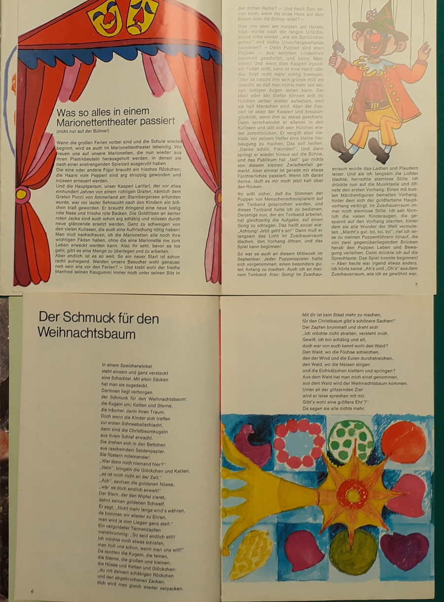 10 / 1971 | Wo ist der Kasperl? (Schreibschrift); Im Zaubergarten v. Dolores Travaglini (Schreibschrift); Weihnachtsbäume v. Rosemarie Künzler-Behncke; Der bunte Zimmermann v. Lotte Prechter-Kahle | Schöne Illustrationen von Monika Böving; Umfang 20 Seiten - normal geheftet; Heftkanten etwas bestoßen; guter altersgemäßer Zustand | 3 |