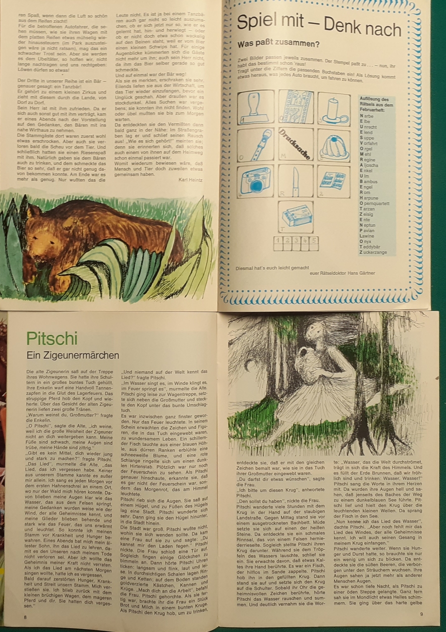 11 / 1976 | Neun vergebliche Wunder v. A. Baur; Im Nebel v. Marianne Kaindl; Die drei Wünsche - Spiel nach Johann Peter Hebel; Wir basteln Brettpuppen; Peng .. Peng ... Peng ...; Josefine und ihr Kater Moritz v. Karl Heintz; Verkehrserziehung v. J. W. König | Schöne Illustrationen von verschied. Künstlern; Umfang 20 Seiten - normal geheftet; Heftkanten etwas bestoßen; guter altersgemäßer Zustand | 3 |