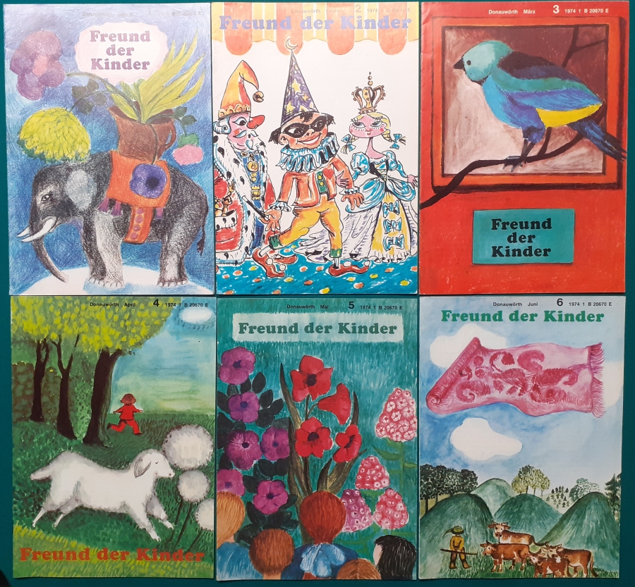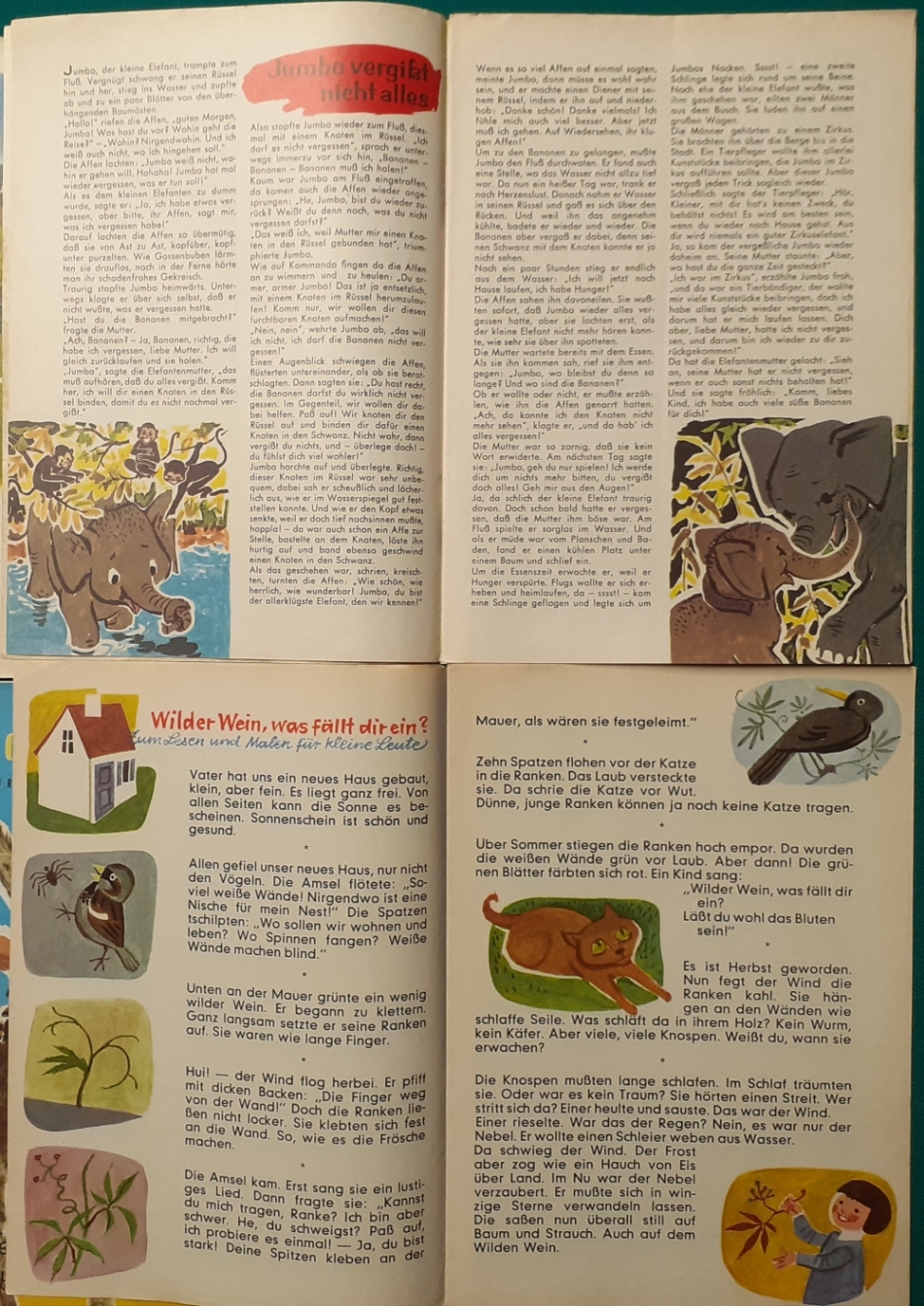 6 / 1963 | Isangabo, die Zauberin; Die Geschichte von dem kleinen blauen Zwerg; Jazinta hat ihn nicht gesehen; Unser Kirschbaum; Spiel auf der Harmonika; Heiner fährt Auto; Heftumschläge: bunt und schön | Schöne Illustrationen von Elfriede Bona; jeweils vier Doppelblätter ineinander gelegt: zusammen 16 Seiten; Kanten bestoßen; guter altersgemäßer Zustand | 4 |