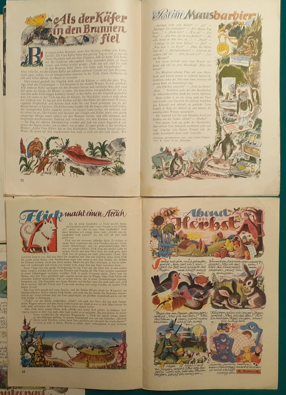 Juni 1953 | Die Geschichte vom Laufkäfer; Frühlings-Abschied; Mimka, der Räuber; Der Vogelfänger: Ein lustiges Kreisspiel | Schöne Illustrationen von Lieselotte Mende; jeweils zwei Doppelblätter ineinander gelegt: zusammen 8 Seiten; Kanten bestoßen; guter altersgemäßer Zustand | 4 |