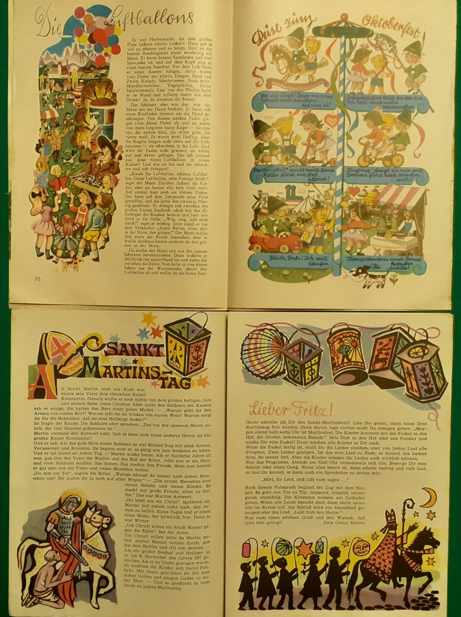 Oktober 1954 | Feierstunde zum Erntedankfest; Die Luftballons; Reise zum Oktoberfest; Heini und die Heide; Zum Erzählen und Malen | Schöne Illustrationen von Ruth Knoblauch-Hüppe; jeweils zwei Doppelblätter ineinander gelegt: zusammen 8 Seiten; Kanten bestoßen; guter altersgemäßer Zustand | 4 |