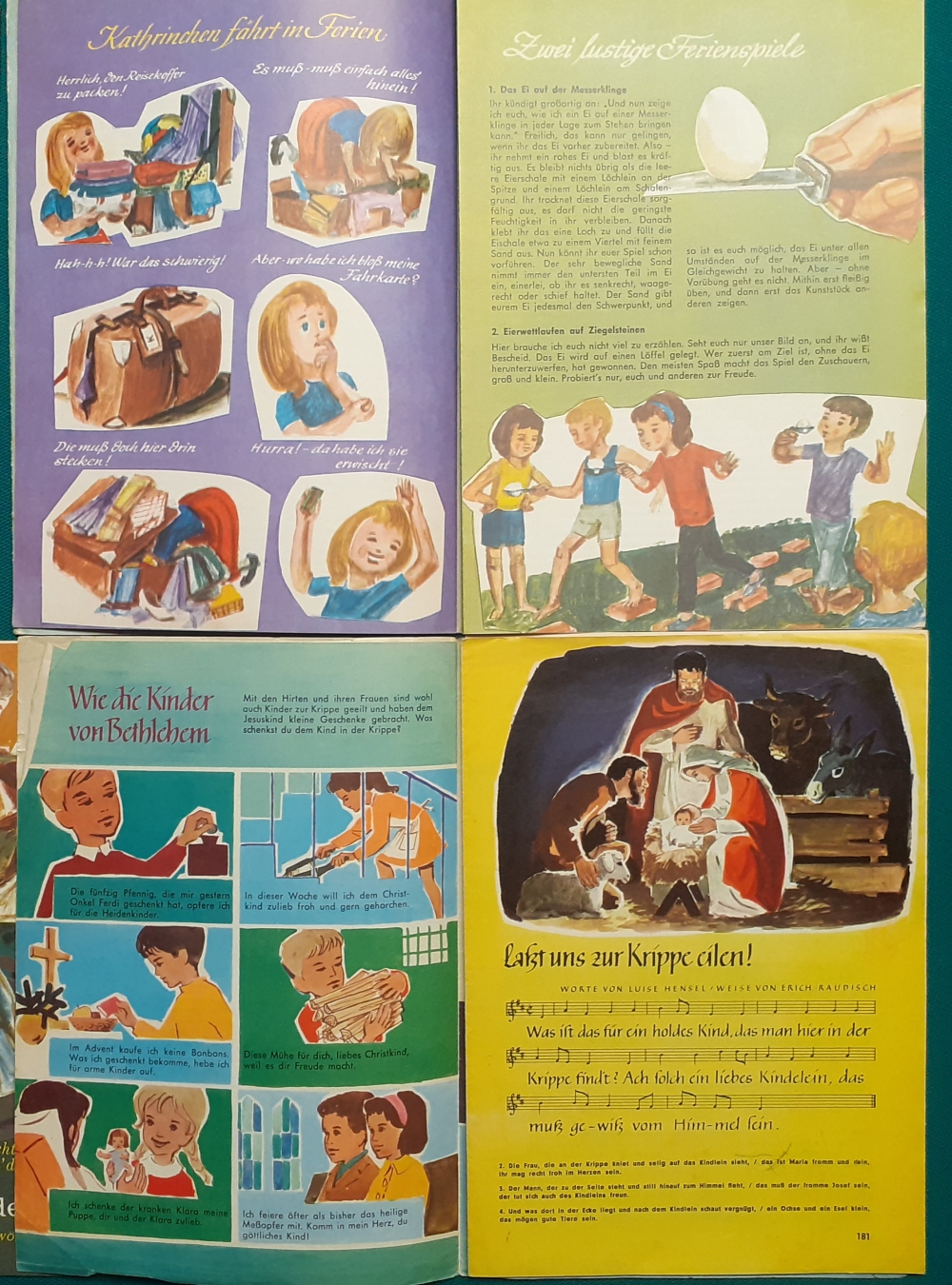 12 / 1965 | Als Sankt Nikolaus kam; Wie die Kinder von Bethlehem; Lied: Laßt uns zur Krippe eilen!; Unser Weihnachtsspiel mit Liedern und Reigen; Wir bauen eine Krippe; Wie ds Christkind zum Jockele kam; Basteln für Weihnachten; Spaß am Sylvestertag; Basteln von Weihnachtsengeln | Schöne Illustrationen von Hanns und Marianne Mannhart; jeweils vier Doppelblätter ineinander gelegt: zusammen 16 Seiten; Kanten bestoßen; guter altersgemäßer Zustand | 4 |