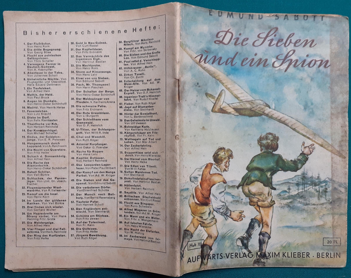 89 | Edmund Sabott mit Illustrationen von Kurt Teßmann | Die Sieben und ein Spion | Ausgabe um 1950, Einband fleckig; insgesamt befriedigender altersgemäßer Zustand | 4 |
