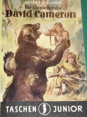 Vorderes Einbandbild in George F. Clarke: Die Abenteuer des David Cameron Ausgabe der frühen 1950er Jahre; siehe auf unserer Seite: Taschenjunior-Bücherei |