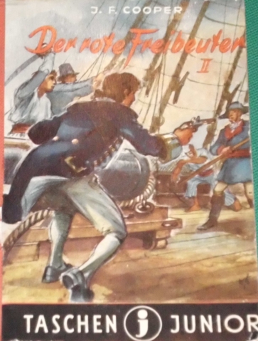 Vorderes Einbandbild in James Fenimore Cooper: Der rote Freibeuter Ausgabe der frühen 1950er Jahre; siehe auf unserer Seite: Taschenjunior-Bücherei |