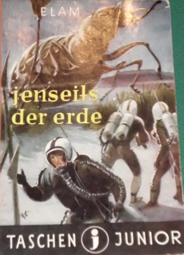 Vorderes Einbandbild in Richard M. Elam jr.: jenseits der Erde Ausgabe der frühen 1950er Jahre; siehe auf unserer Seite: Taschenjunior-Bücherei |