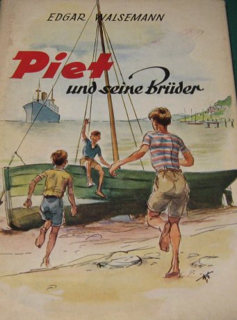 Vorderes Einbandbild von Edgar Walsemann: Piet und seine Brüder vom Oetinger Verlag von 1960; siehe auf unserer Seite: Seefahrtsabenteuer |