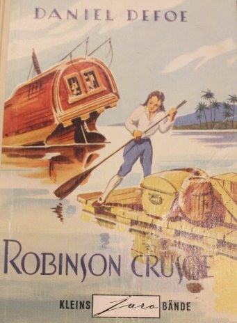 Vorderes Einbandbild in Daniel Defoe: Robinson Crusoe Ausgabe der Kleins Juro Bände um 1955; siehe auf unserer Seite: Kinderbuchreihen - Kleins Jugendbände |