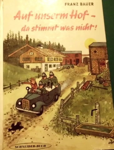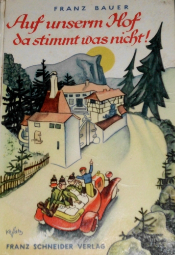 Interessanter Vergleich: etwa 6 Jahre später vom gleichen Illustrator angefertigt - mit modernerem Auto!! Vorderes Einbandbild in Franz Bauer: Auf unserm Hof - da stimmt was nicht! Ausgabe um 1958; siehe auf unserer Seite: Schneider-Lackausgaben der 1950er bis 1990er Jahre |
