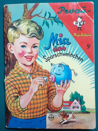 Vorderes Einbandbild in: Mia, das Sparschwein Pevau-Bilderbuch Nr. 9 aus den frühen 1960er Jahren; siehe auf unserer Seite: Pevau-Bücher |