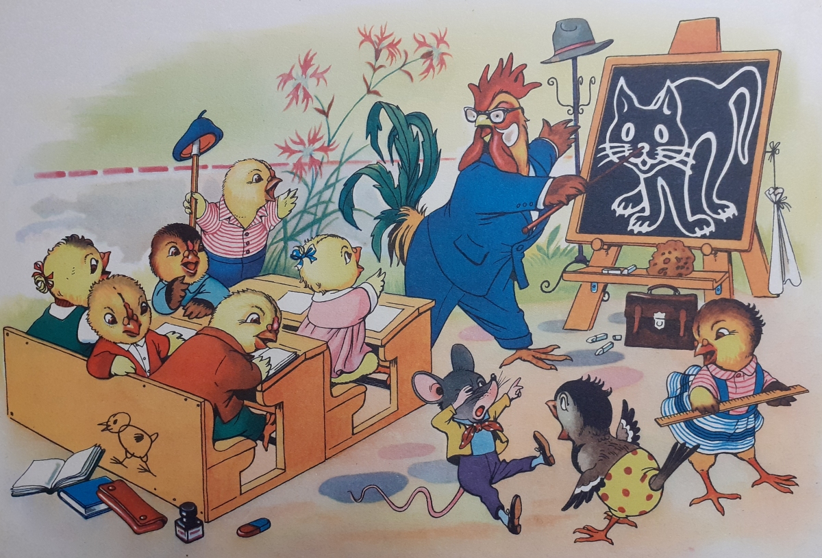 Innen-Illustration in: Die Kükenschule Bilderbuch um Pestalozzi Verlag um 1955; siehe auf unserer Seite: Bilderbücher für die Allerjüngsten |