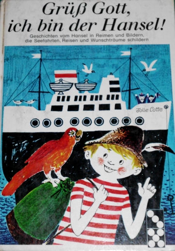 Vorderes Einbandbild in James Krüss: Grüß Gott, ich bin der Hansel! Ausgabe im Domino Verlag von 1968; siehe auf unserer Seite: Ausgaben von James Krüss |