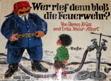 Vorderes Einbandbild in James Krüss: Wer rief denn bloß die Feuerwehr? Ausgabe im Boje Verlag von 1974; siehe auf unserer Seite: Ausgaben von James Krüss |