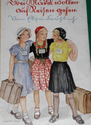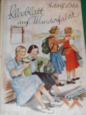 Vorderes Einbandbild in Adolf Löhr: Kleeblatt auf Wanderfahrt Kleeblatt-Mädchenbuchreihe der 1940er bis 1950er Jahre; siehe auf unserer Seite: Ausgaben von Adolf Löhr |