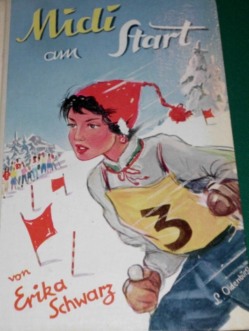 Vorderes Einbandbild in Erika Schwarz: Midi am Start; Erstausgabe von 1955 im