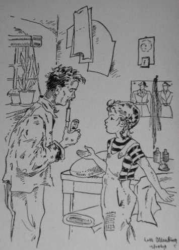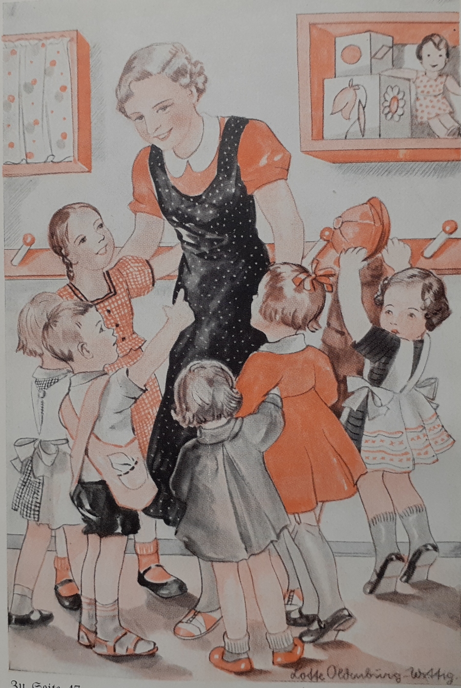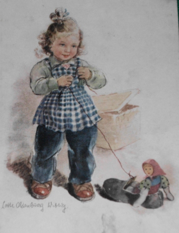 Lotte Oldenburg-Wittig (geb. am 27. Februar 1896 in Leipzig; gest. 1982 in ???) war eine deutsche Malerin, Grafikerin und Illustratorin. Lotte Oldenburg-Wittig studierte an der Kunstakademie in Leipzig. Die Illustratorin zeichnete vor allem Mädchenbücher und Jungmädelliteratur. Die ersten Illustrationen in unserer Sammlung finden sich in den 1930er Jahren. Dort hat sie z.B. die bekannten Reihen von Magda Trott: Goldköpfchen sowie Pommerle illustriert. Sie war gerade in den frühen 1950er Jahren eine der am häufigsten genannten Illustratorinnen für Mädchenbücher. Sie illustrierte bis in die 1950er Jahre vor allem für den Schneiderverlag, dort sehr erfolgreich für die Mädchenbücher von Margarete Haller (z.B. Gisel und Ursel), aber auch für viele andere Autoren. Außerdem war sie sehr aktiv bei der Illustration der Boje-Bücher (siehe unsere gelben Leinenrücken-Ausgaben). Dort vor allem für die Autorin Emma Gündel mit den Elke-Büchern und Hans Erich Seuberlich mit der Bettina-Reihe. Lotte Oldenburg-Wittig zeichnet in einem ganz eigenen Stil ihre Kindermotive und hat mit ihren Arbeiten einen hohen Wiedererkennungswert. Signatur der Illustratoren siehe oben |