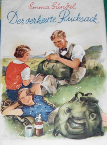 Vorderes Einbandbild in Emma Gündel: Der verhexte Rucksack Ausgabe um 1940 im Hans Jörg Fischer Verlag (später Boje Verlag); siehe auf unserer Seite: Ausgaben von Emma Gündel |