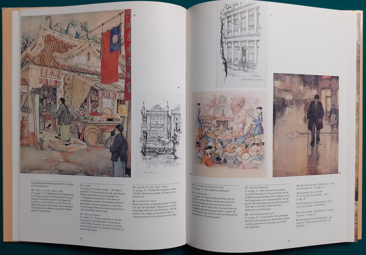 Anton Franciscus Pieck (geb. am 19. April 1895 in Den Helder; gest. am 25. November 1987 in Overveen) war ein niederländischer Maler, Zeichner und Grafiker. Bereits in der Kindheit wurde das künstlerische Talent Anton Piecks erkannt. Nachdem die Familie im Jahr 1906 nach Den Haag, der Geburtsstadt des Vaters, umgezogen war, besuchten er und sein ebenfalls talentierter Bruder neben der regulären Schule abends Zeichenkurse. Pieck war von 1920 bis zu seiner Pensionierung im Jahr 1960 Zeichenlehrer in Bloemendaal. Seit den frühen 1920er-Jahren war er auch als Illustrator tätig und illustrierte Märchenbücher und zahlreiche weitere Werke. Seine Zeichnungen haben häufig nostalgischen Charakter und stellen das Leben im vorindustriellen Zeitalter dar. Auch die Farbgebung ist entsprechend von warmen, gedeckten Farbtönen bestimmt. In den Niederlanden sind seine Arbeiten sehr populär und finden sich auch auf Kalendern, Notizbüchern, Puzzles, Memory-Spielen und zahlreichen anderen Artikeln. Zu Beginn der 1950er-Jahre wurde Pieck mit der Gestaltung des ursprünglichen Märchenparks im Efteling in Kaatsheuvel betraut, aus dem sich der größte Vergnügungspark der Niederlande entwickelte. Bis ins Jahr 1974 blieb er hauptverantwortlicher Gestalter des Parks. Auch nach seiner offiziellen Pensionierung wurde er regelmäßig in die Entwicklung des Parks mit einbezogen und war bis zu seinem Tod als Berater tätig. Noch heute sind in dem Freizeitpark zahlreiche Designs Piecks zu finden, und auch bei den neueren Gebäuden versucht der Freizeitpark die nostalgische Atmosphäre Piecks zu erhalten und lässt sich von seinen Plänen und Zeichnungen inspirieren. In seinem Sterbeort Overveen wurde Pieck mit einer Bronze-Büste gewürdigt, außerdem wurde eine Schule in Kaatsheuvel nach ihm benannt. Seit 1984 gibt es in Hattem (südlich von Zwolle) ein Anton Pieck Museum. Informationen von wikipedia, Stand: 29.10.2024 |