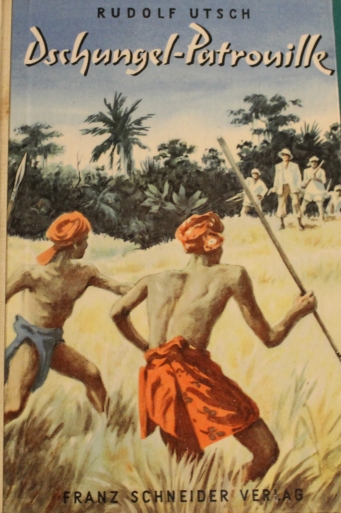 Vorderes Einbandbild in Rudolf Utsch: Dschungel-Patrouille Ausgabe um 1958 im Schneider Verlag; siehe auf unserer Seite: Schneider-Halbleinen-Ausgaben der 1950er und 1960er Jahre ... |