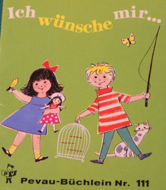 Vorderes Einbandbild in Christel Süßmann: Ich wünsche mir ... Mini-Bilderbuch der Pevau-Reihe im Pestalozzi-Verlag von 1979; siehe auf unserer Seite: Pevau/Pestalozzi-Minibilderbücher |