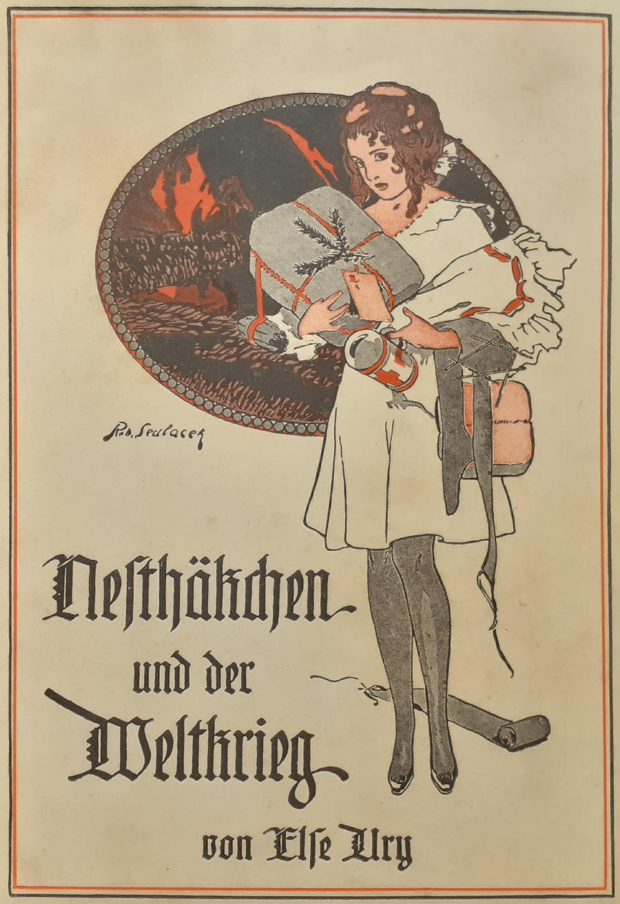 seltensten deutschen Kinderbücher: Einbandbild in Else Ury: Nesthäkchen und der Weltkrieg (Band 4 der Nesthäkchen-Reihe); Meidingers Jugendschriften, Berlin; Erstausgabe um 1920; siehe hier unsere Bücher von Else Ury ... |