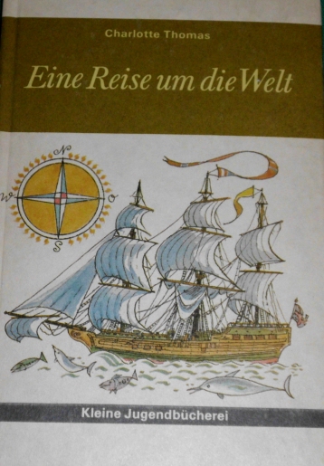 Vorderes Einbandbild in Charlotte Thomas: Eine Reise um die Welt; aus der Kleinen Jugendbücherei im Postreiter Verlag, Halle; Ausgabe von 1986; siehe auf unserer Seite: Kinderbücher - Kinderbuchreihen - Postreiter-Jugendreihe |